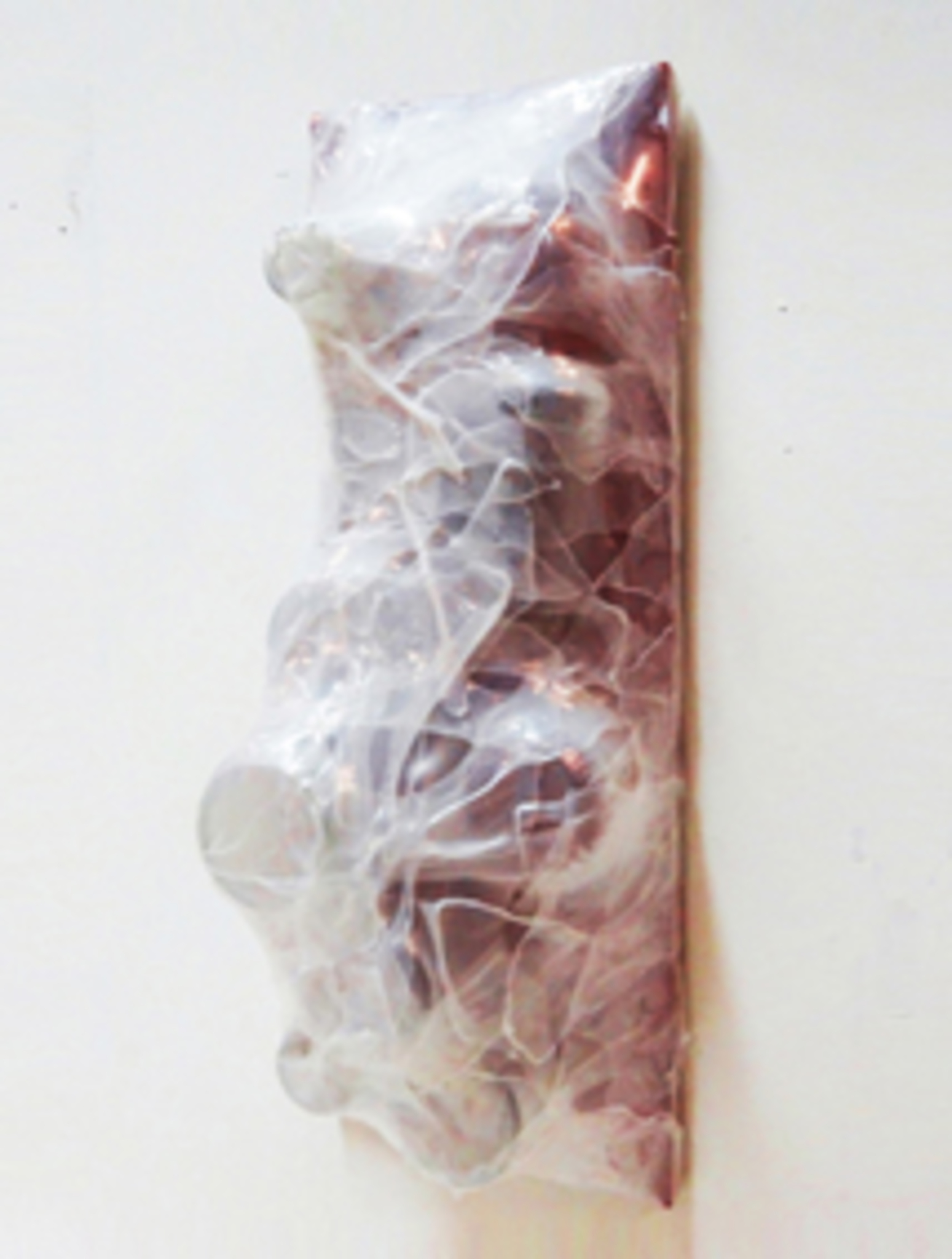 3 dimensional wall piece, used glassware and shrink wrap on wood.