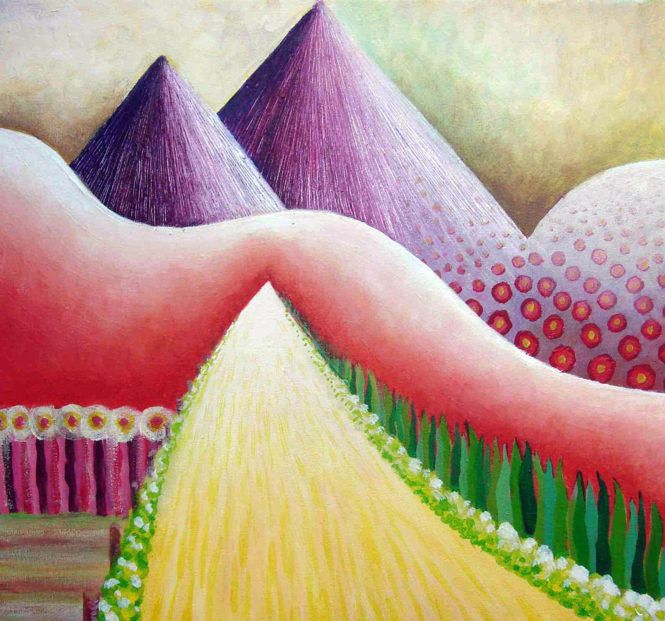 Rood Geel Landschap Acryl Surrealistisch Natuur Bergen Weg