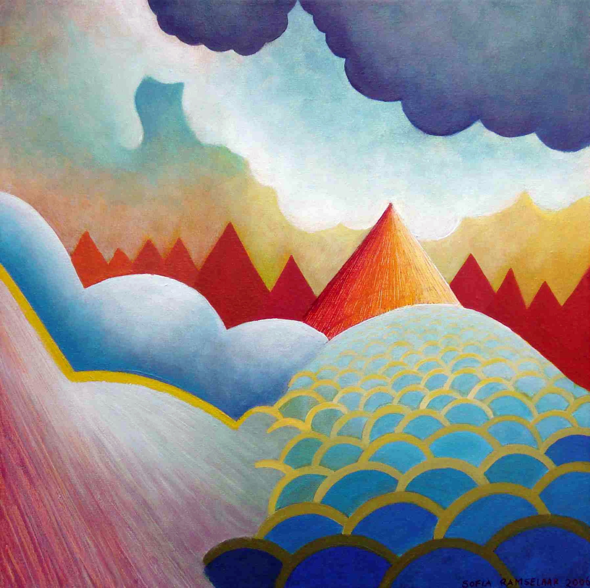 Rood Geel Landschap Acryl Surrealistisch Natuur Bergen Weg