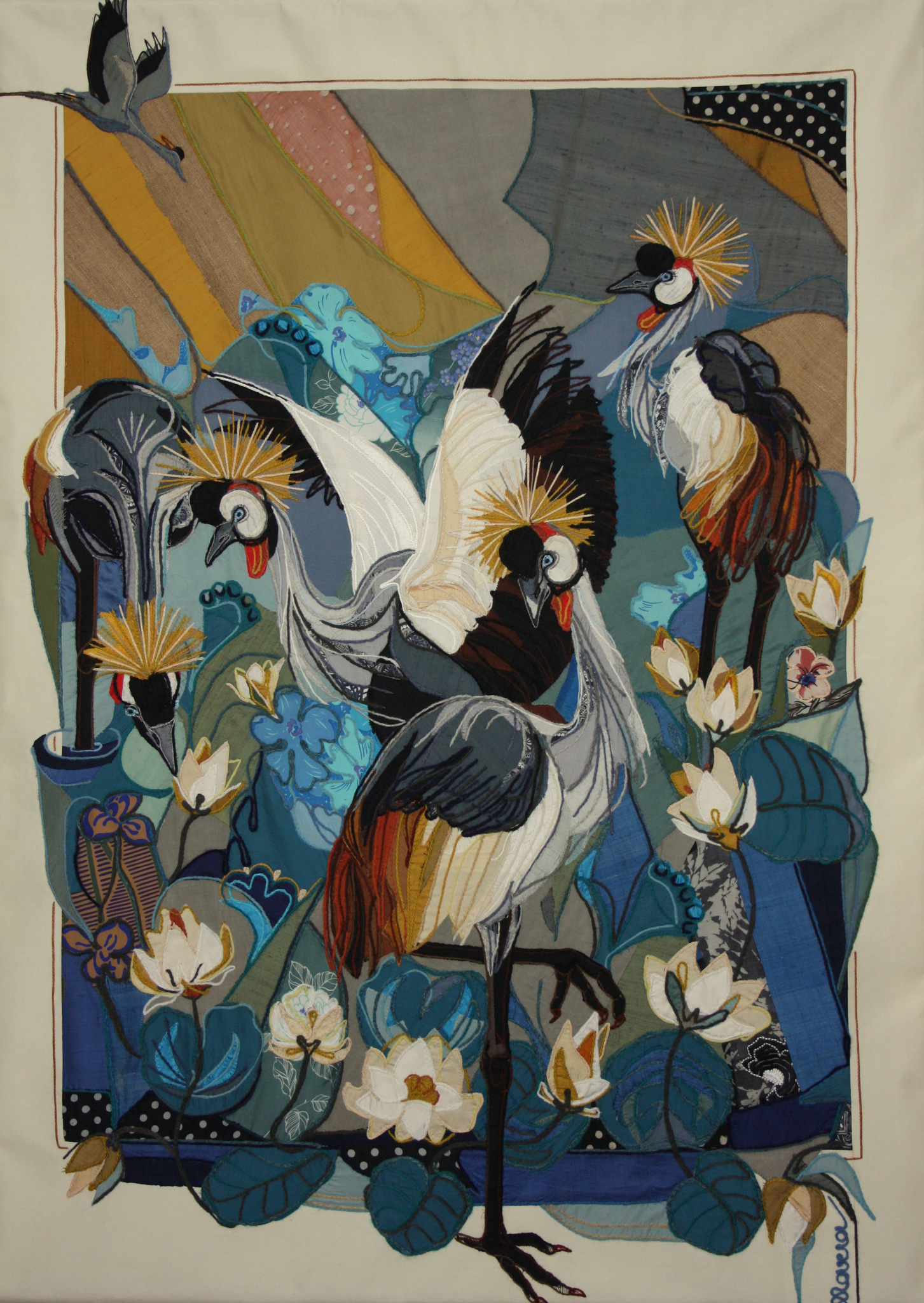 Textielobject in natuurzijde uitgewerkt met draden wol. Ik heb deze mooie Afrikaanse kroonkraanvogels afgebeeld bij een meertje met waterlelies. Deze vogel is ook afgebeeld in de Oegandese vlag
