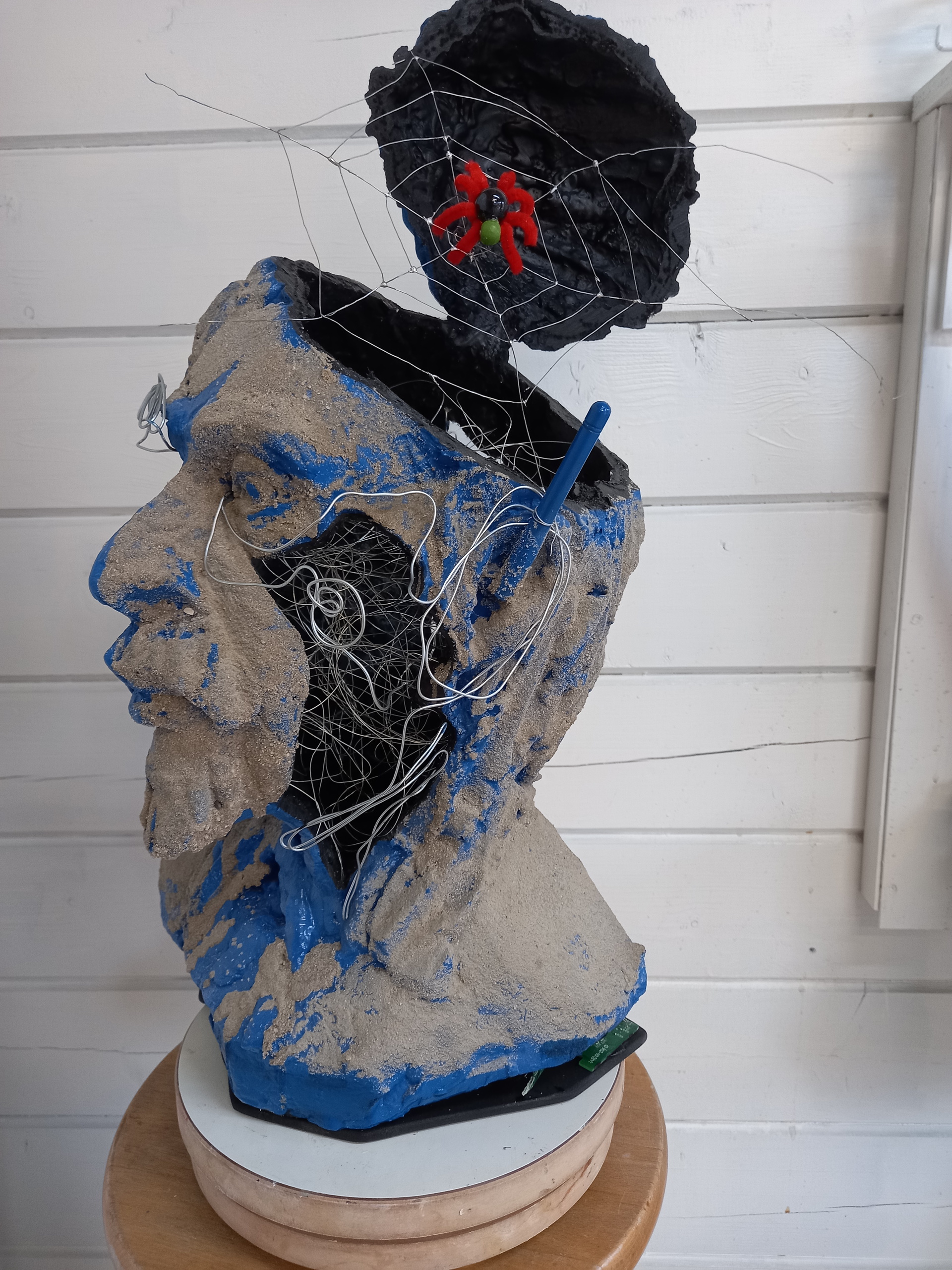 Een blauw portret, gevuld met een warrig spinsel van ijzerdraad en led-verlichting, en onder de hals/nek de harde logica van de elektronica. De mens, ondersteund door veel elektronica dat uiteindelijk verwerkt moet worden door de onnavolgbare hersenen, een warrig spinsel.