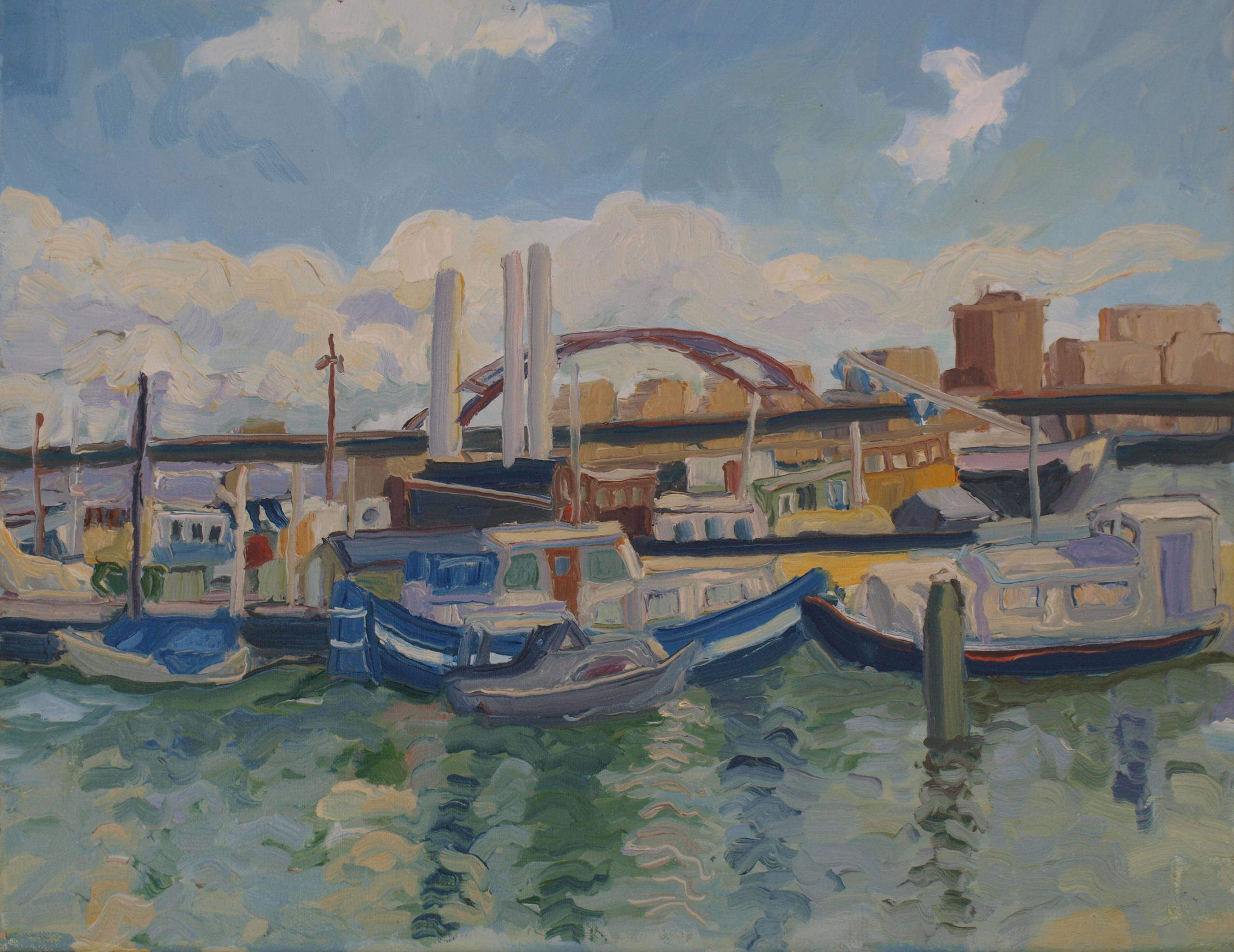 Stadsgezicht Stadschilderij Boot Boten Brug Water Pleinair Pleinairschilderij Olieverf Olieverfschilderij