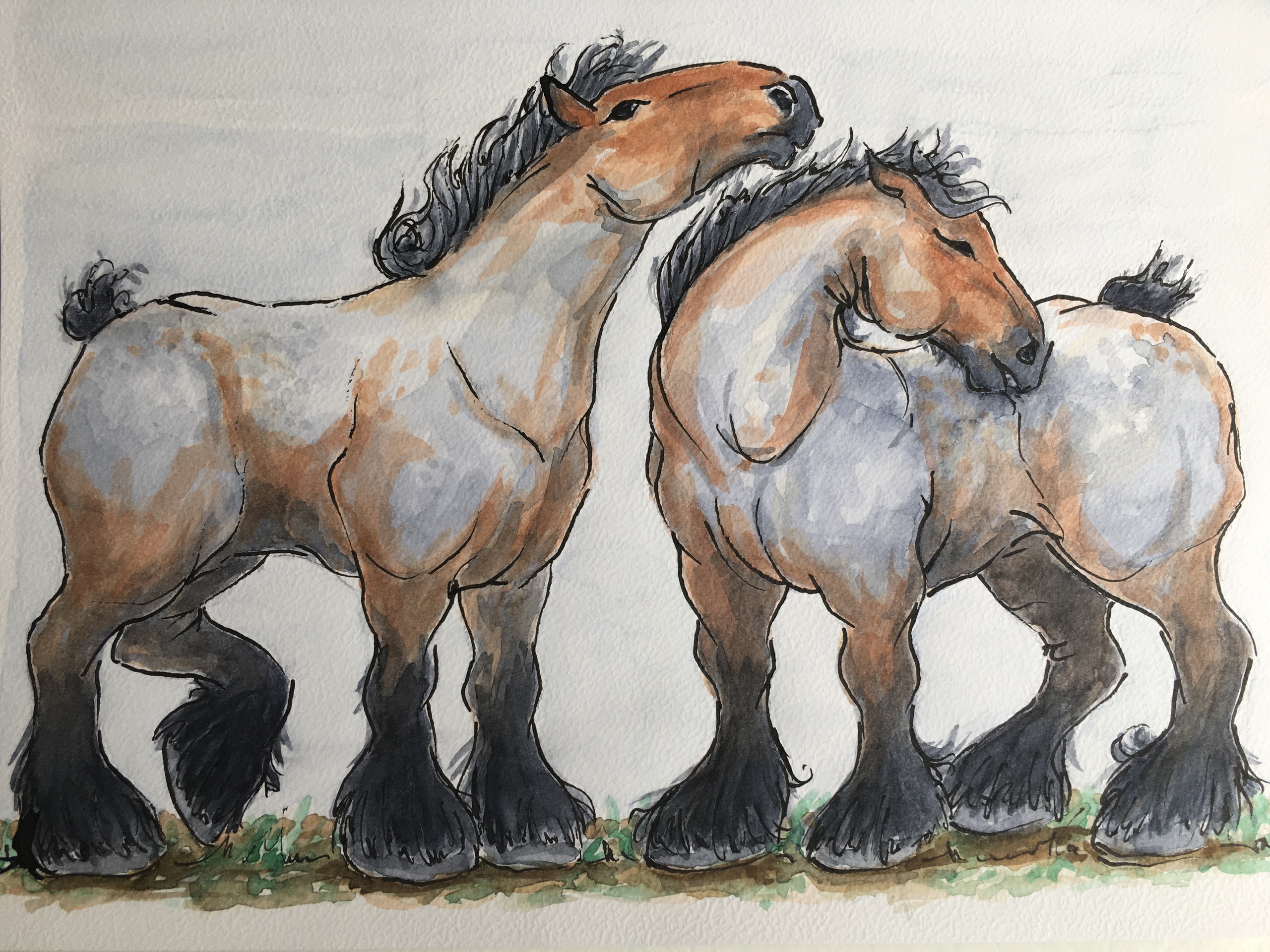 "Twee Zeeuwse Paarden". 2021. Zeeuwse Paarden zijn voor mij een bron van inspiratie. Ik woon in Schouwen Duiveland en elke keer als ik langs Scharendijke rijd om naar Zierikzee te gaan zie ik in de polder verschillende paarden tafereeltjes. Deze keer waren deze twee paarden. Het leek een soort dans/spel, zo majestueus. Ik stop en neem fotos en schets iets snel voordat ik te laat op mijn afspraak kom. Techiek aquarel en indische inkt op 300gr. aquarel papier. A4 format. De aquarel is te koop. Interesse stuur mij een berichtje. Ik ben lid kunstenaar van de CBK Zeeland(Middelburg). Sommige van mijn schilderijen zijn te huur en te koop via de kunstuitleen. Mijn kleine schilderijen en keramiek waren via de webshop "Kunstbezorg" van de CBK te koop. Een initiatief om Zeeuwse kunstenaars te helpen.