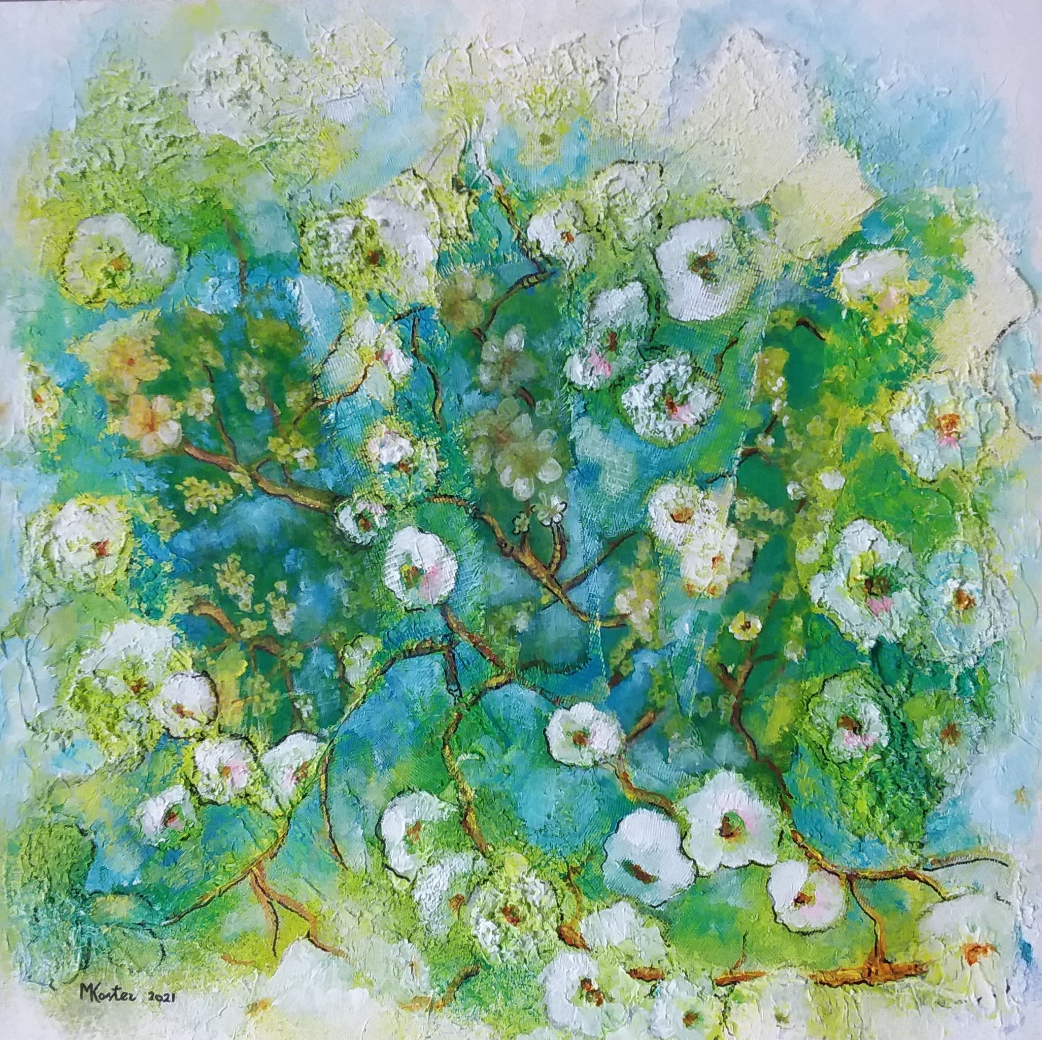 Opgezet op paneel met reepjes stof met van Gogh motief amandelbloesem. Daarop met structuur en verf een eigen creatie opgebouwd. Het werk is gevernist en voorzien van een baklijst met ophangsysteem. Prijs is compleet.