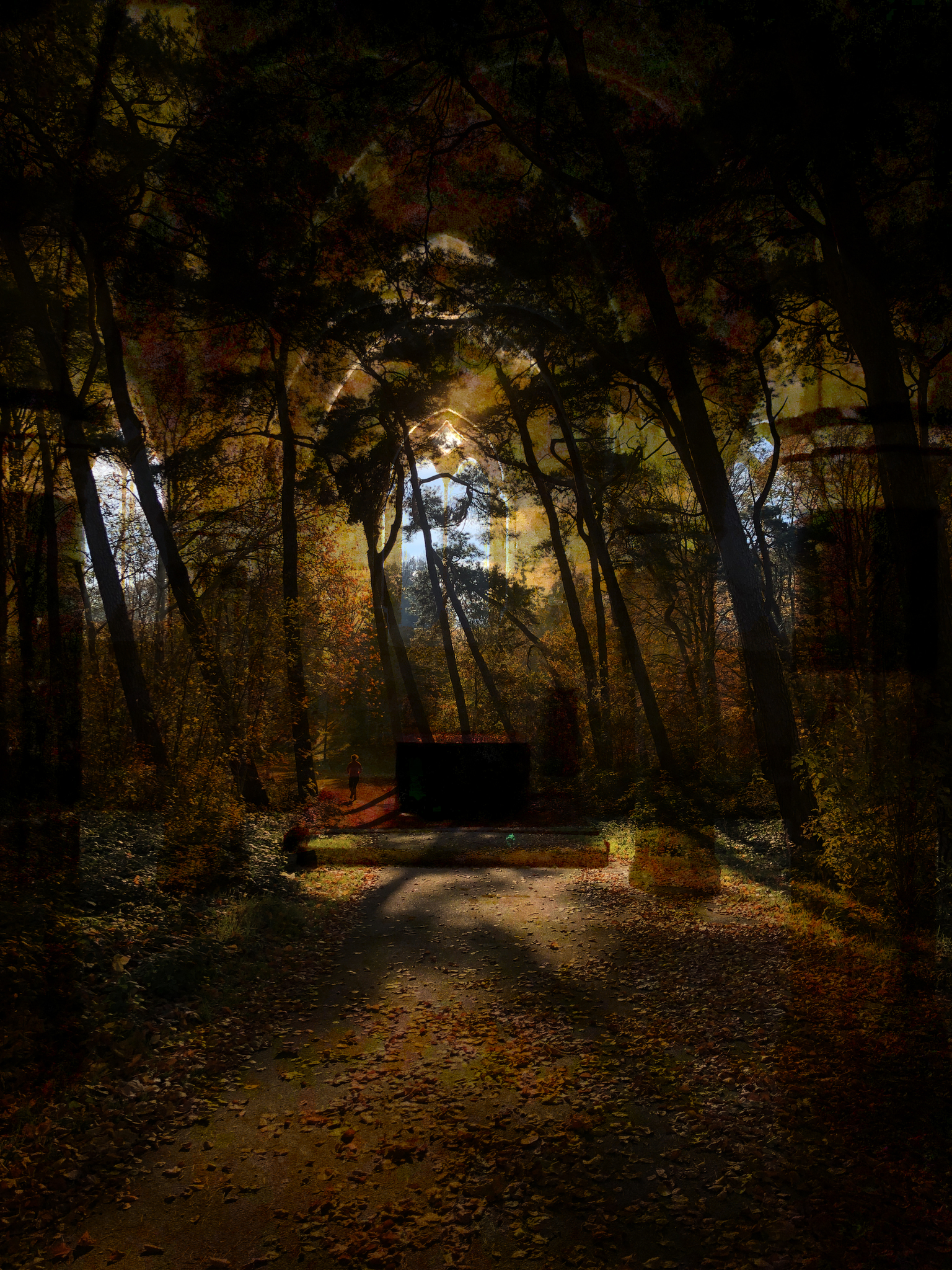 Rood Geel Licht Bladeren Bomen Herfst Donker Blad Bos Park Goffertpark Ritme Ritueel Raam Mysterie Heilig Kapel Doos Window Grond Rennen Lopen Pijnboom Altaar Seizoen