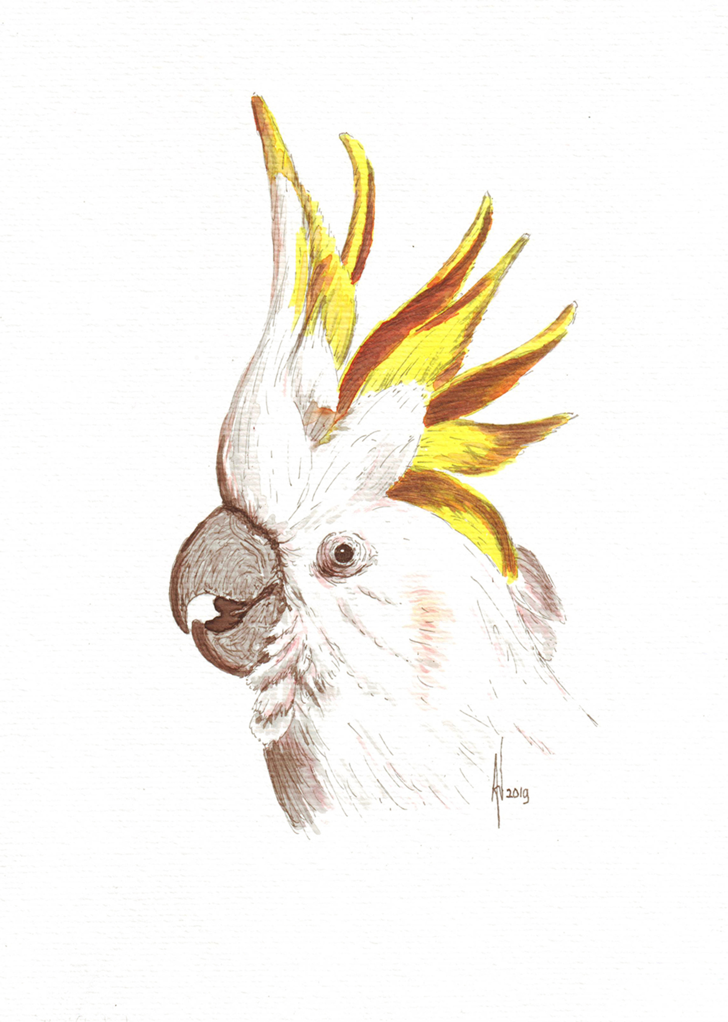 Vogel Kaketoe Geel Wit Lijn Inkt Ecoline Realisme Realistisch Natuur Fauna Vlieger Illustratie