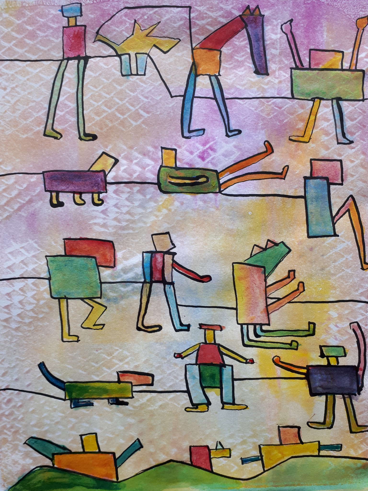 Het hoekige volkje. Mixed media. Monoprint Golden Open Acrylverf en ecoline stift.op papier.