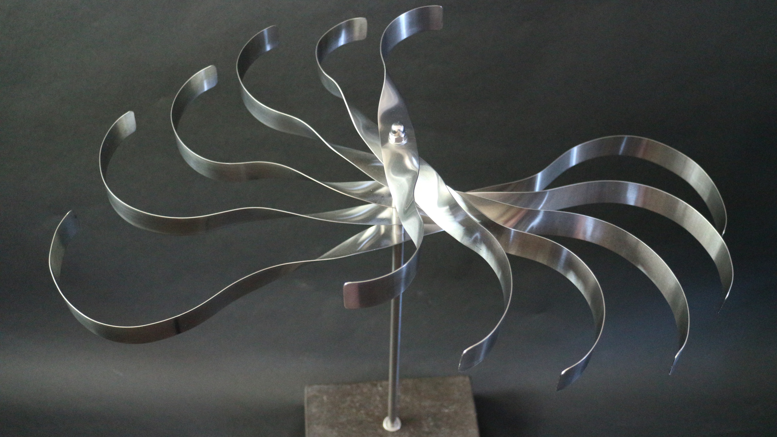 Een draaibaar opgesteld sculptuur. Het is gemaakt van 3 cm brede strips van 1 mm dikte. Buiten geplaatst zal het"Flying-wheel" reageren op de wind.