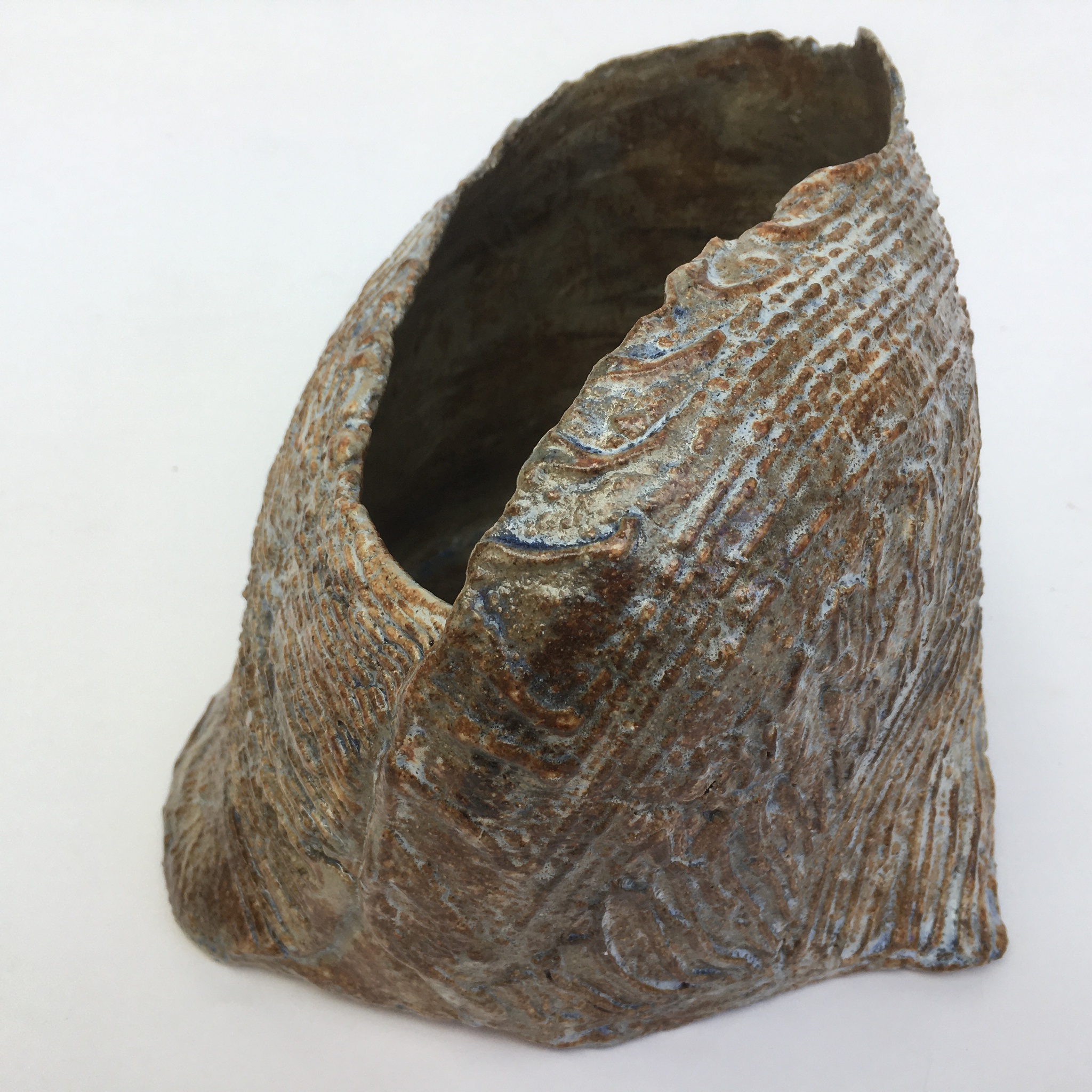 Dit object van keramiek is handgemaakt. Het is gevormd vanuit een lap klei waarin ik een reliëf heb aangebracht. Het zelfgemaakte glazuur versterkt het reliëfeffect. Ik streef naar een natuurlijke uitstraling. Het object is hoog gestookt op 1240 graden in een elektrische oven. Het is dus waterdicht. Het is geschikt als vaas voor ikebana.