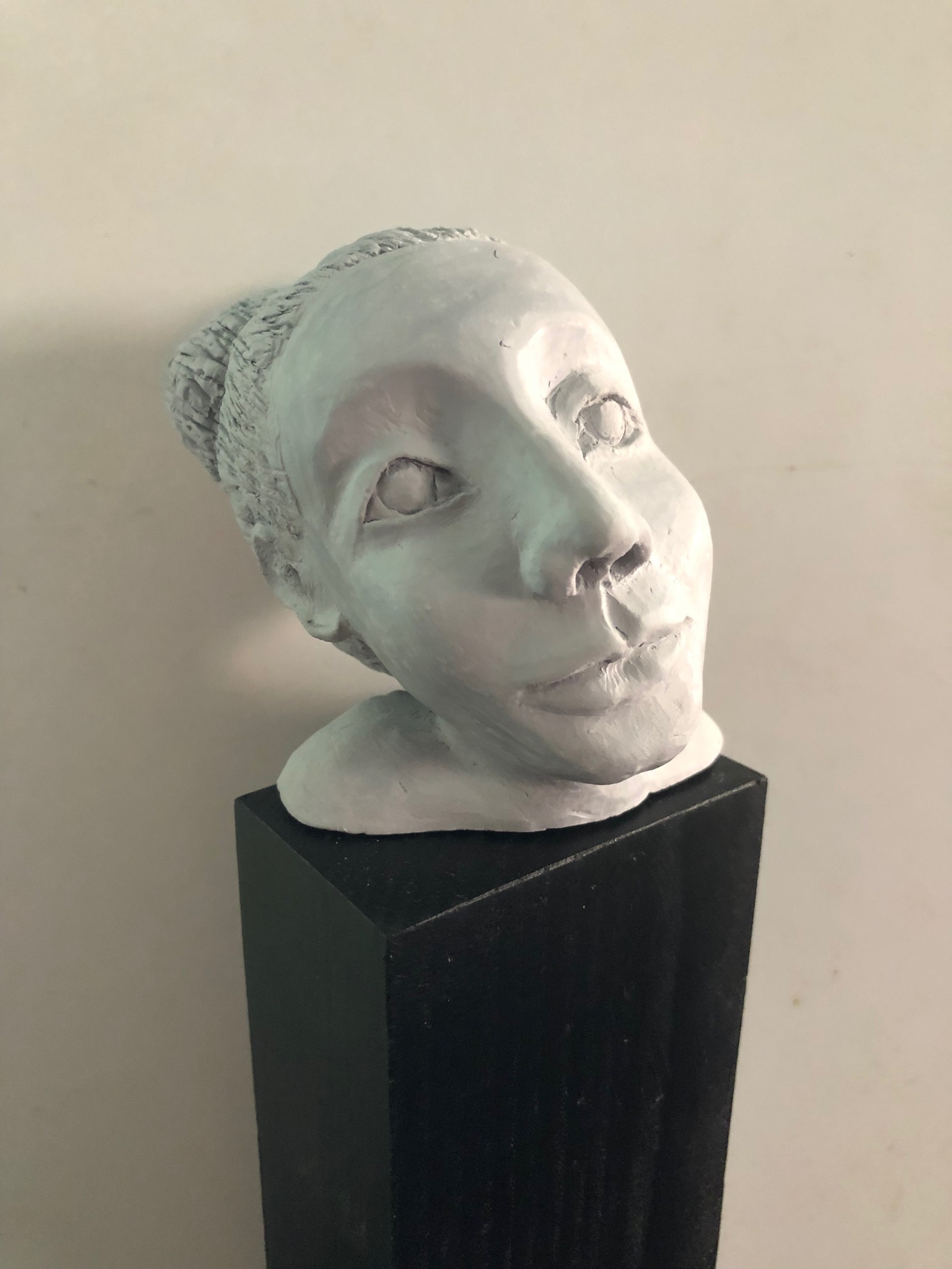 Grijs meisjeskopje van porselein op hoge zwarte sokkel.