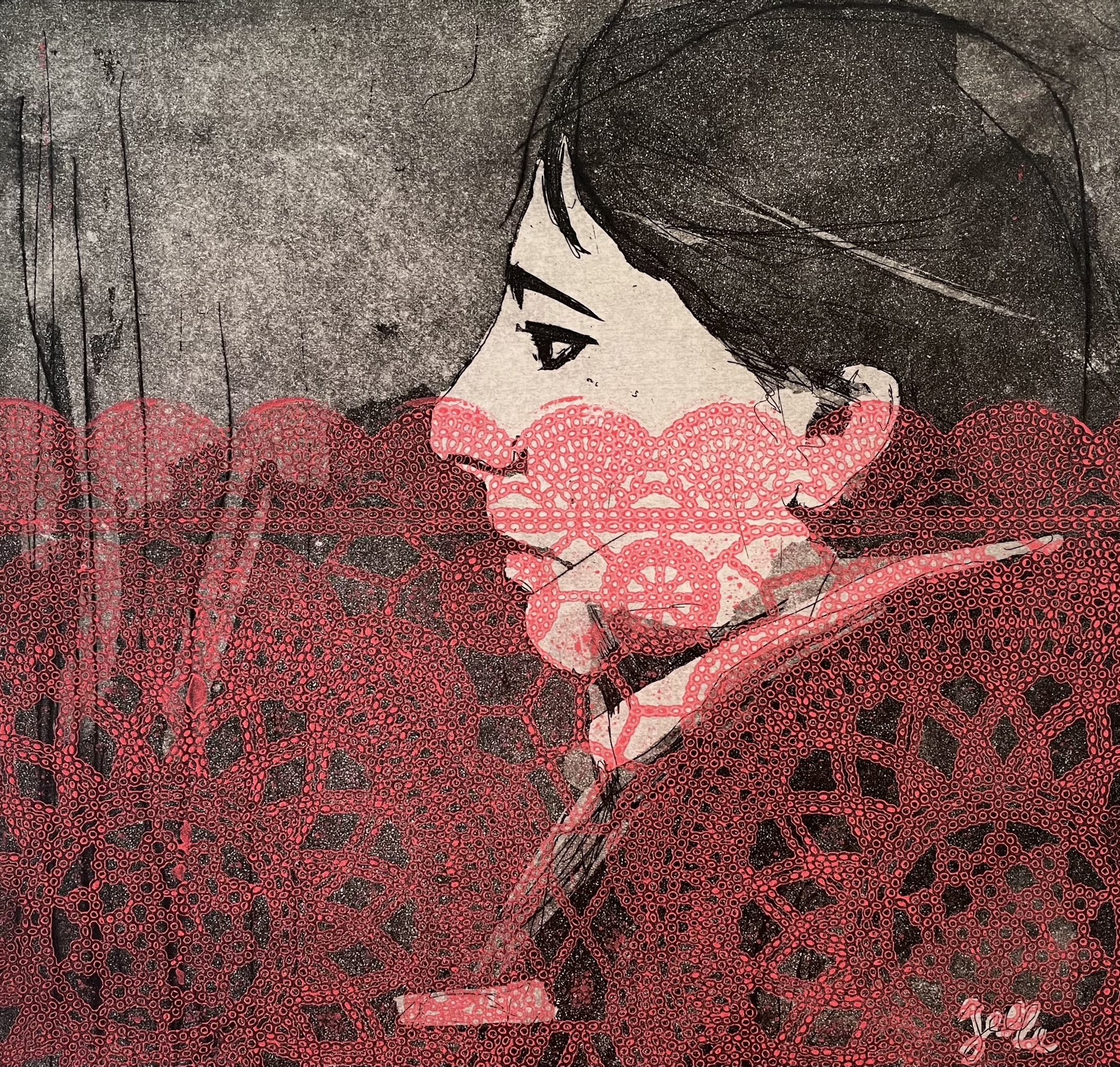 Ets, aquatint, droge naald / sjabloondruk. Inzending voor internationale tentoonstelling Turkijje Uit de mondkapjes-serie in het kader van de Corona pandemie.