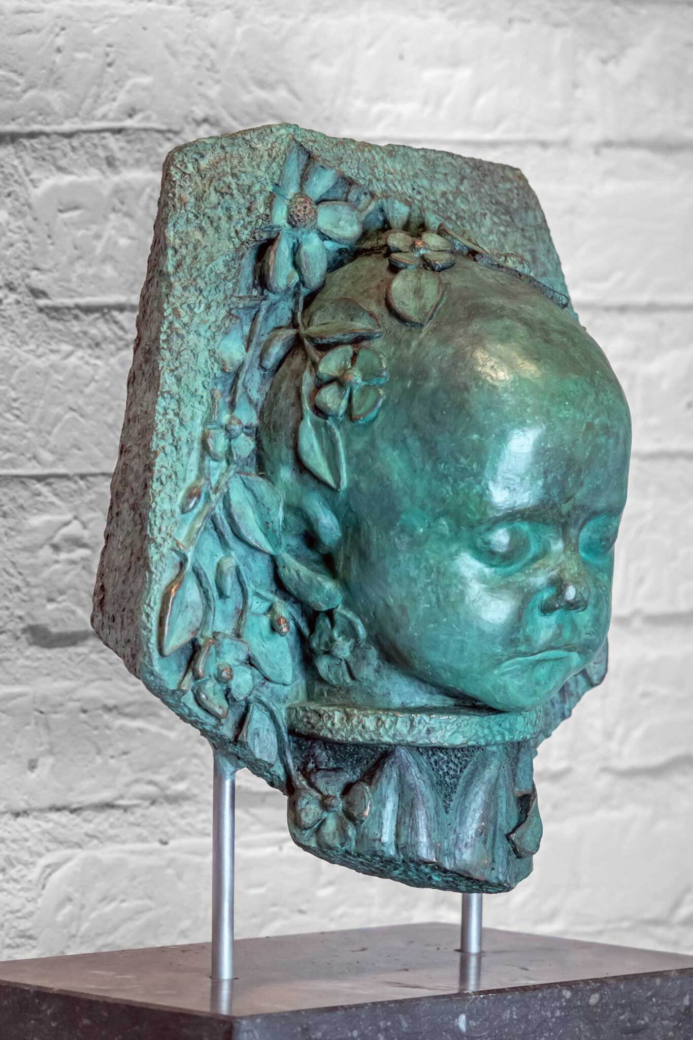 Het uitgangspunt is een replica van een antiek dodenmaskertje van een baby. Ik heb het gezichtje altijd al aandoenlijk gevonden. Nu kreeg ik het idee om het toe te passen op een brok steen dat zogenaamd bij opgravingen in het oude Rome tevoorschijn is gekomen, als een soort hommage . . . Ik ga de roestvrij stalen pennen nog wat inkorten en de sokkel wordt iets kleiner.