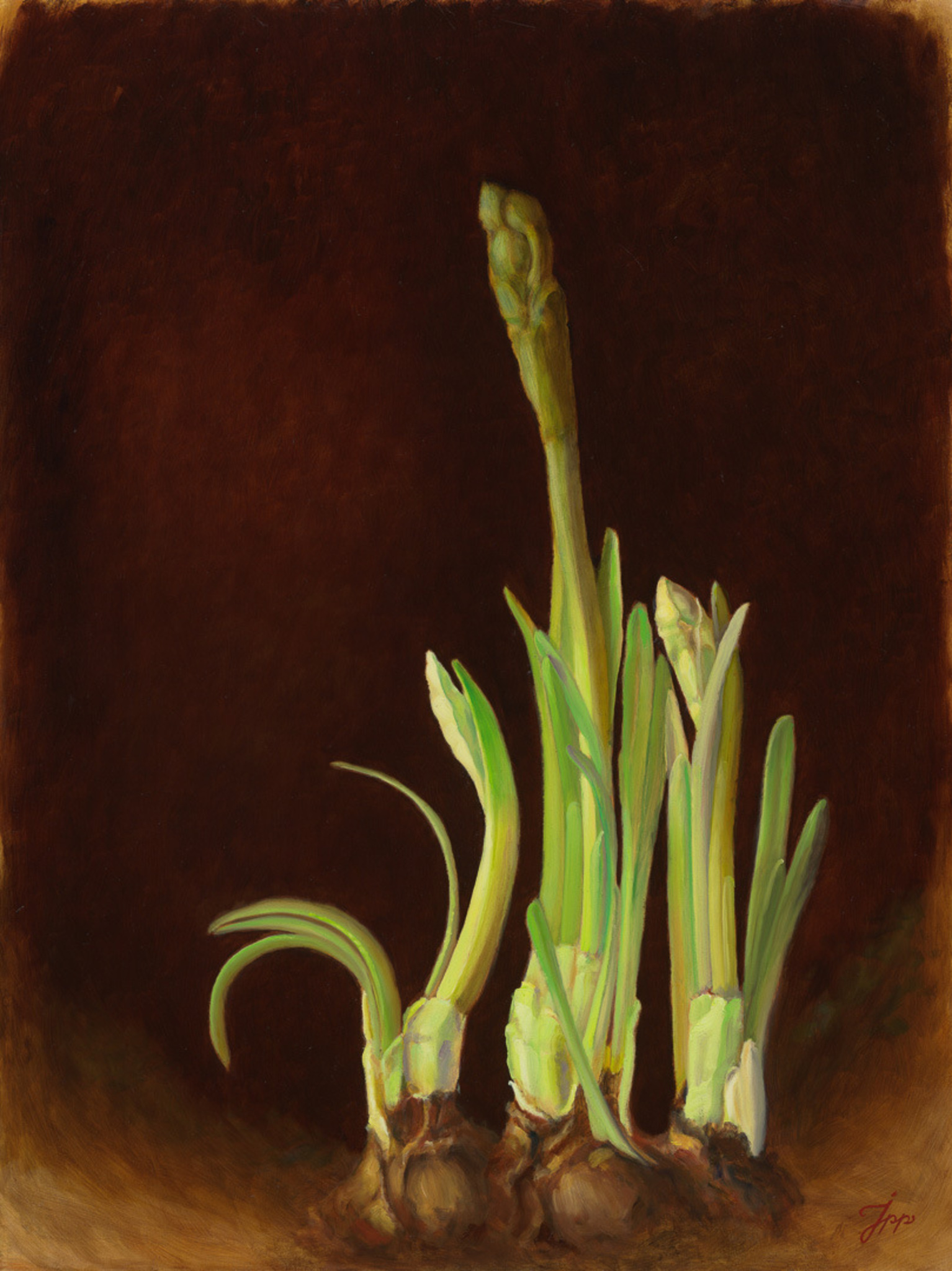 Schilderij Geel Groen Bruin Monumentaal Olieverf Paneel Natuur Lente Nieuw Voorjaar Begin Bloembol Narcis Crown Gelaagd Narcissus Bridal Kunstgeschiedenis
