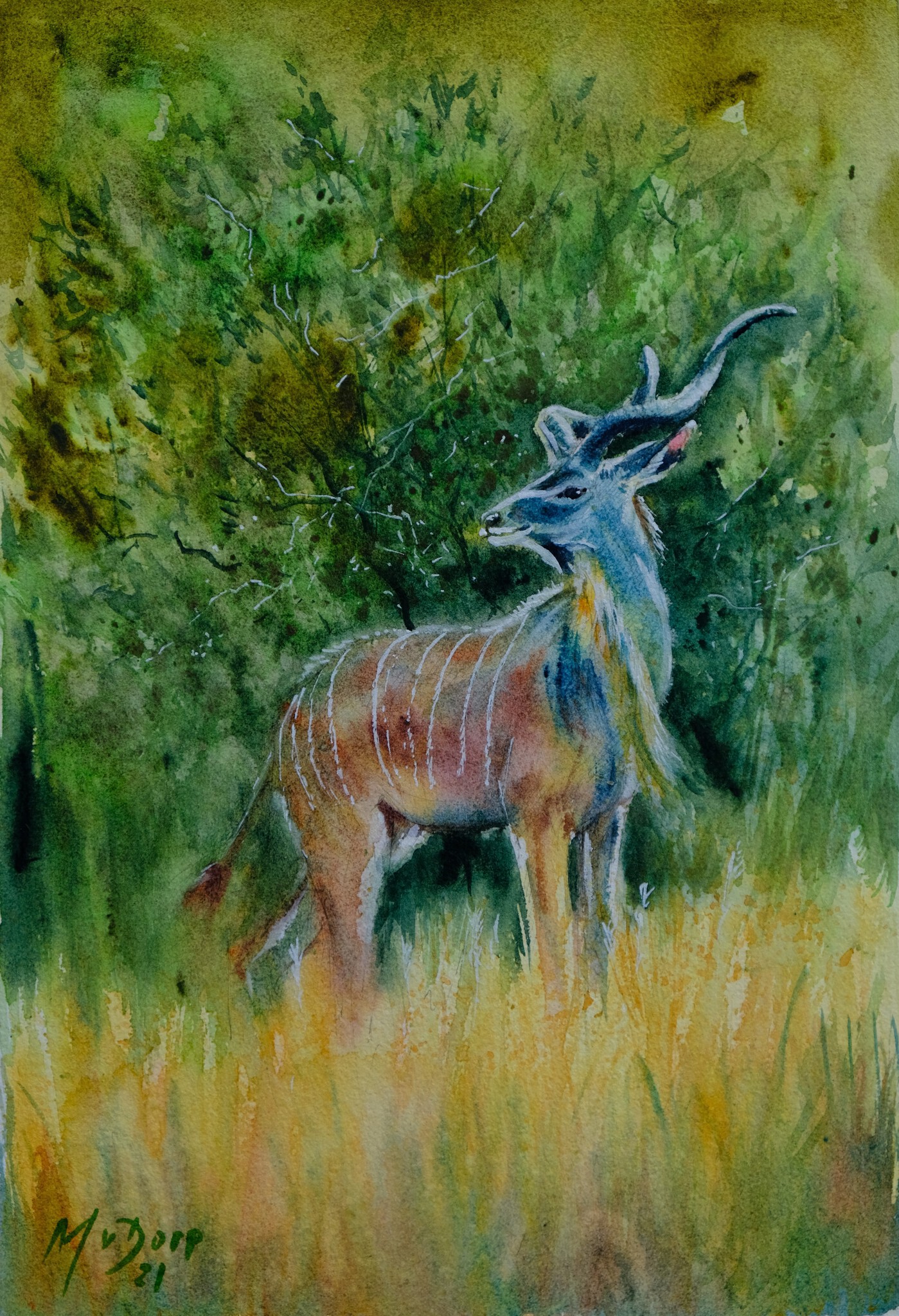 Dit kudu mannetje kwam prachtig uit het landschap in het avond licht. Krugerpark.