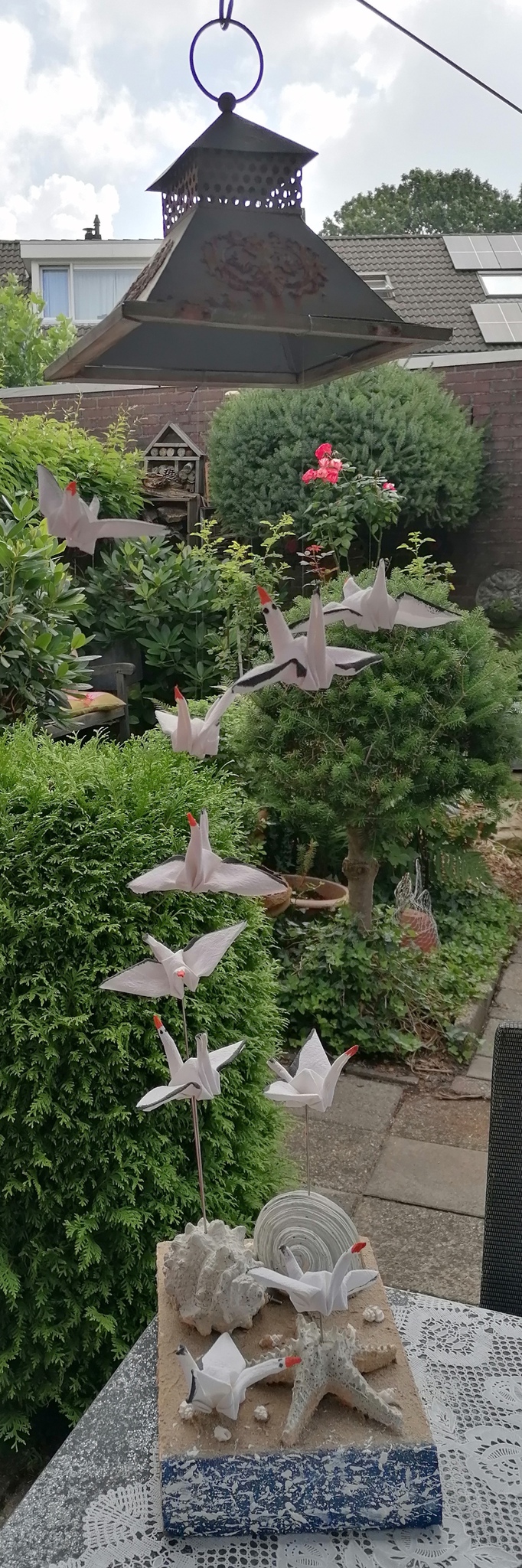 Object Heimwee naar de zee Object Vervaardigd van verschillende materialen Met origami gevouwen meeuwen van stof De meeuwen kunnen in verschillende standen gezet worden Uniek eenmalig