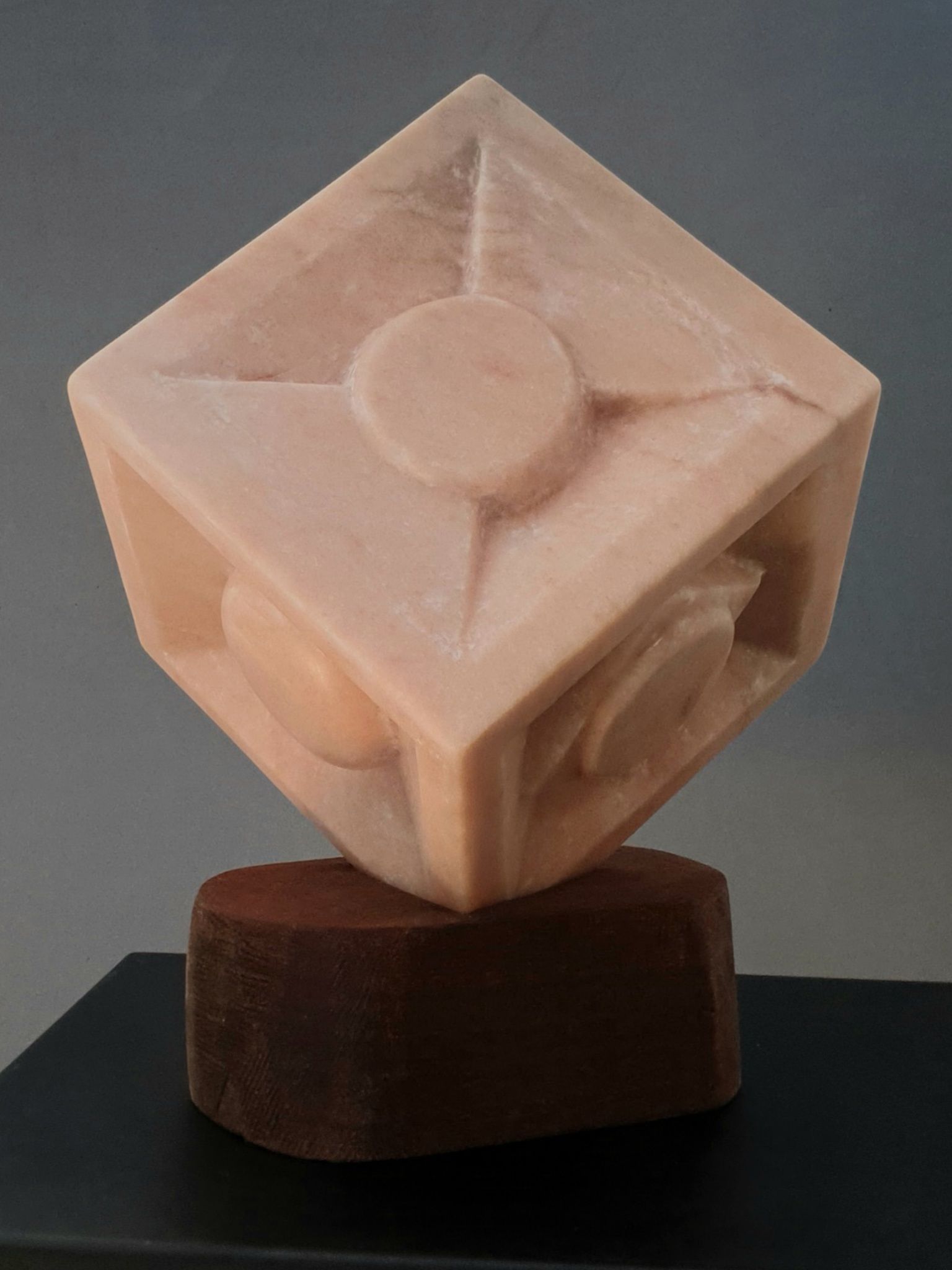 Een kubus van roze Portugees marmer, waarvan elk vlak een andere variatie is van hetzelfde uitgangspunt