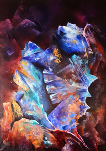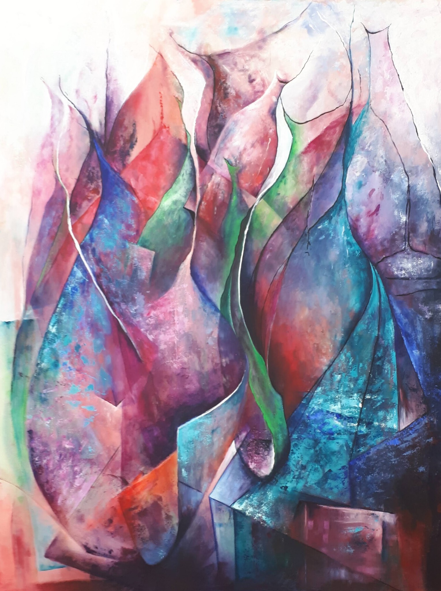 Acrylverf op doek. Inspiratie: veranderingen hangen in de lucht; vanuit de zwaarte naar zachtheid; botsende elementen; zoeken naar harmonie;
