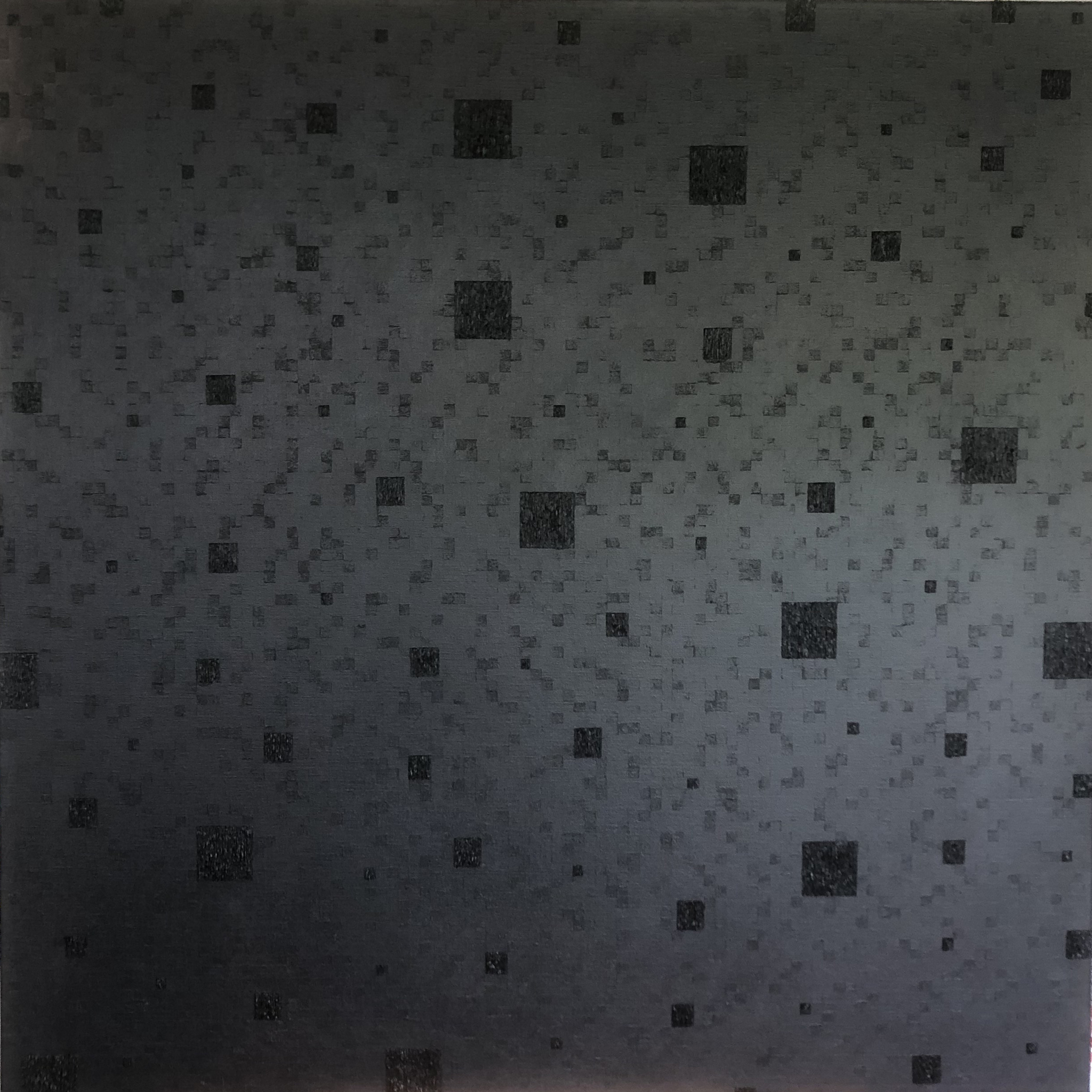 Thema: Chaos (Geometrische Chaos) Mijn kunst is beïnvloedt door de moderne wiskundige en wetenschappelijke benadering van het begrip complexe orde van de natuur. Met name heb ik me verdiept in de Chaos theorie en de fractal geometrie. Ik ben geen wiskundige, en ik gebruik geen wiskundige formules. De ideeën van de Chaos theorie en fractal geometrie leiden tot de ontwikkeling van de composities in mijn werk. Ik gebruik driehoeken,vierkanten en cirkels in mijn schilderijen, maar in mijn huidige serie, geoChao richt ik me alleen op de vierkanten en de verhoudingen tussen de vierkanten. Ik ontwikkel mijn composities door kleine vierkantjes op grote te zetten of grote op kleine te zetten. Het gaat om de onderlinge verhoudingen tussen de vierkanten. Ik laat de methode die ik kies de compositi