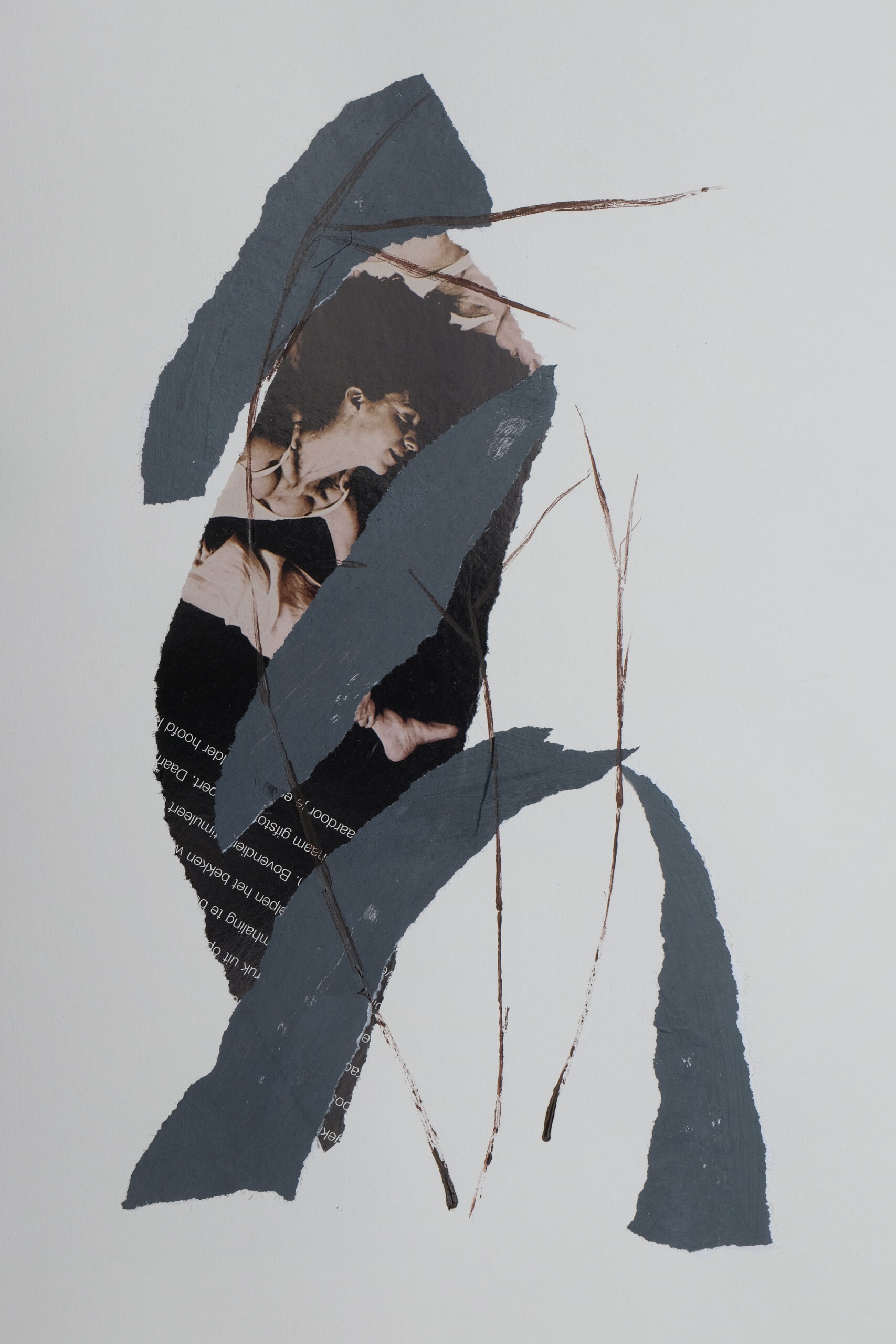 Laat zwerfstukken in beeld / en stop je oren niet dicht / met akoestische doping. // Beweeg alleen maar / en wordt herinnerd. (dans vorm, collage foto tijdschrift Happinez, objet trouvé en monoprint)