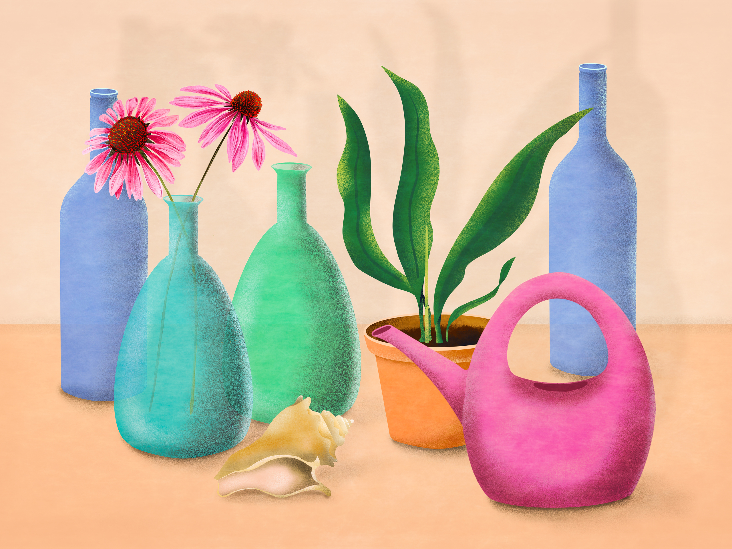 Stilleven Gieter Bloem Fles Kamerplant Tekening Illustratie Interieur Binnenshuis
