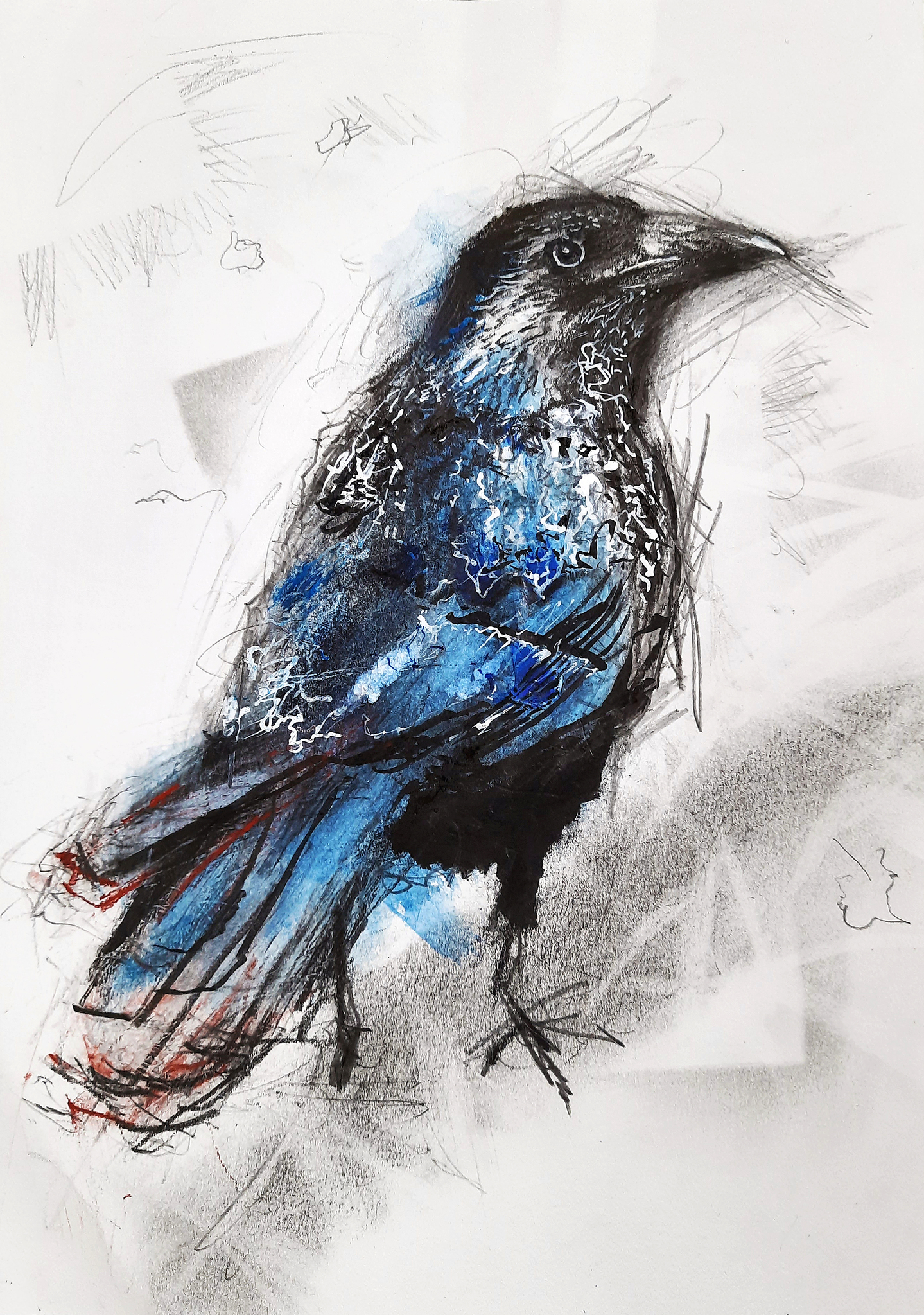Blauw Vogel Potlood Natuur Pastel Inkt Kraai
