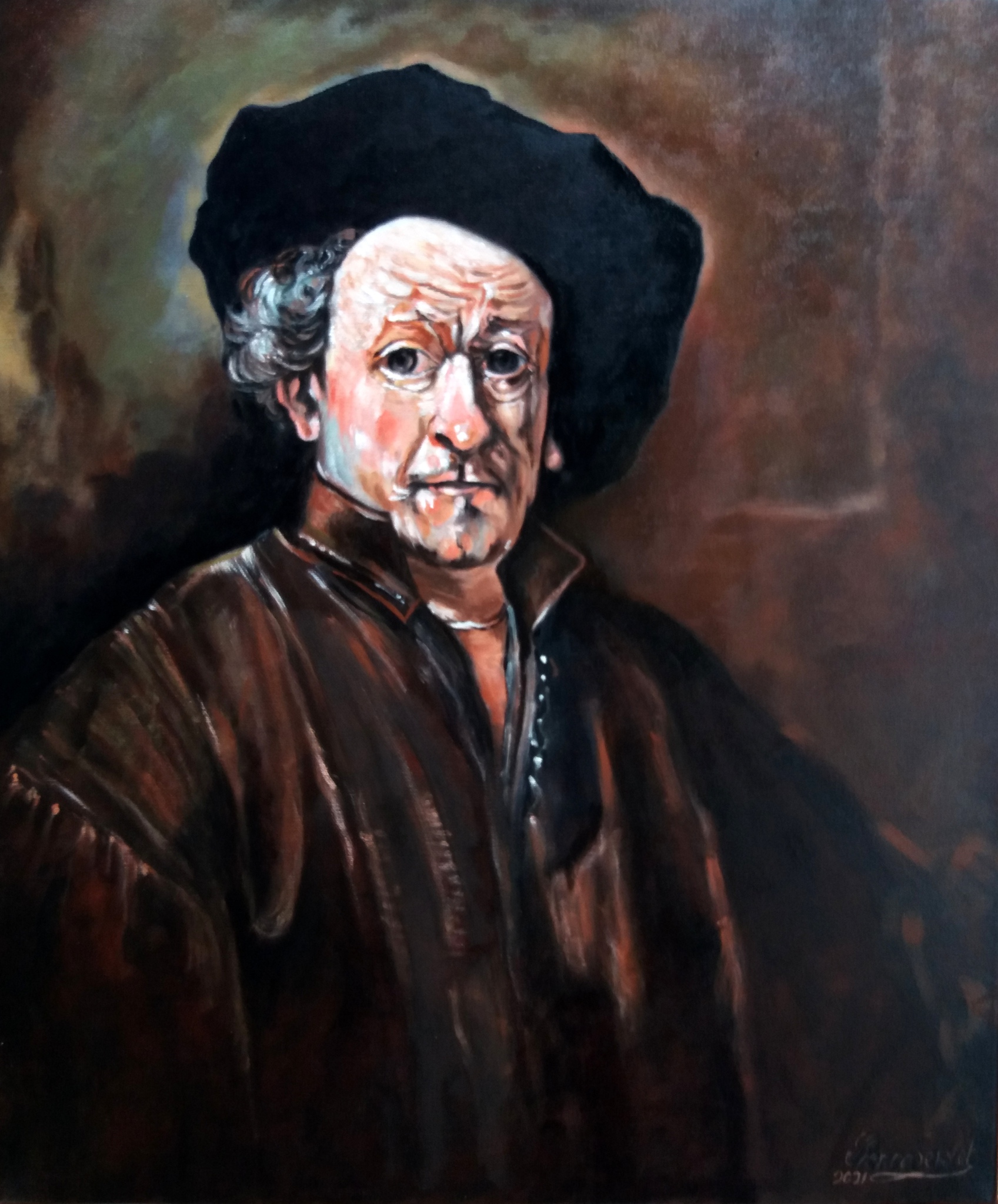This painting is made by me to a portraiture with a self-portrait from Rembrandt. It is oil painted on linen