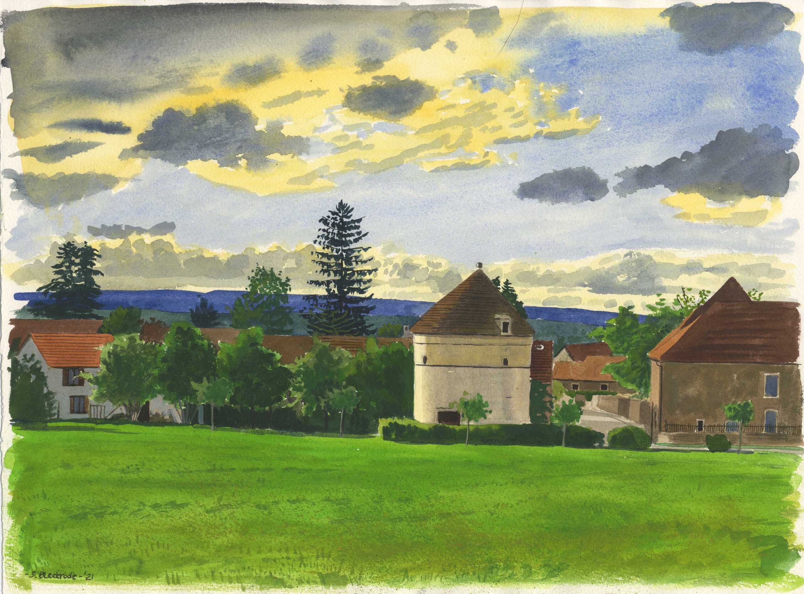 Frankrijk France Dorp Village Landschap Landscape Auquarel Watercolor Watercolour Realisme Realism Licht Light Lucht Sky Schilderij Painting