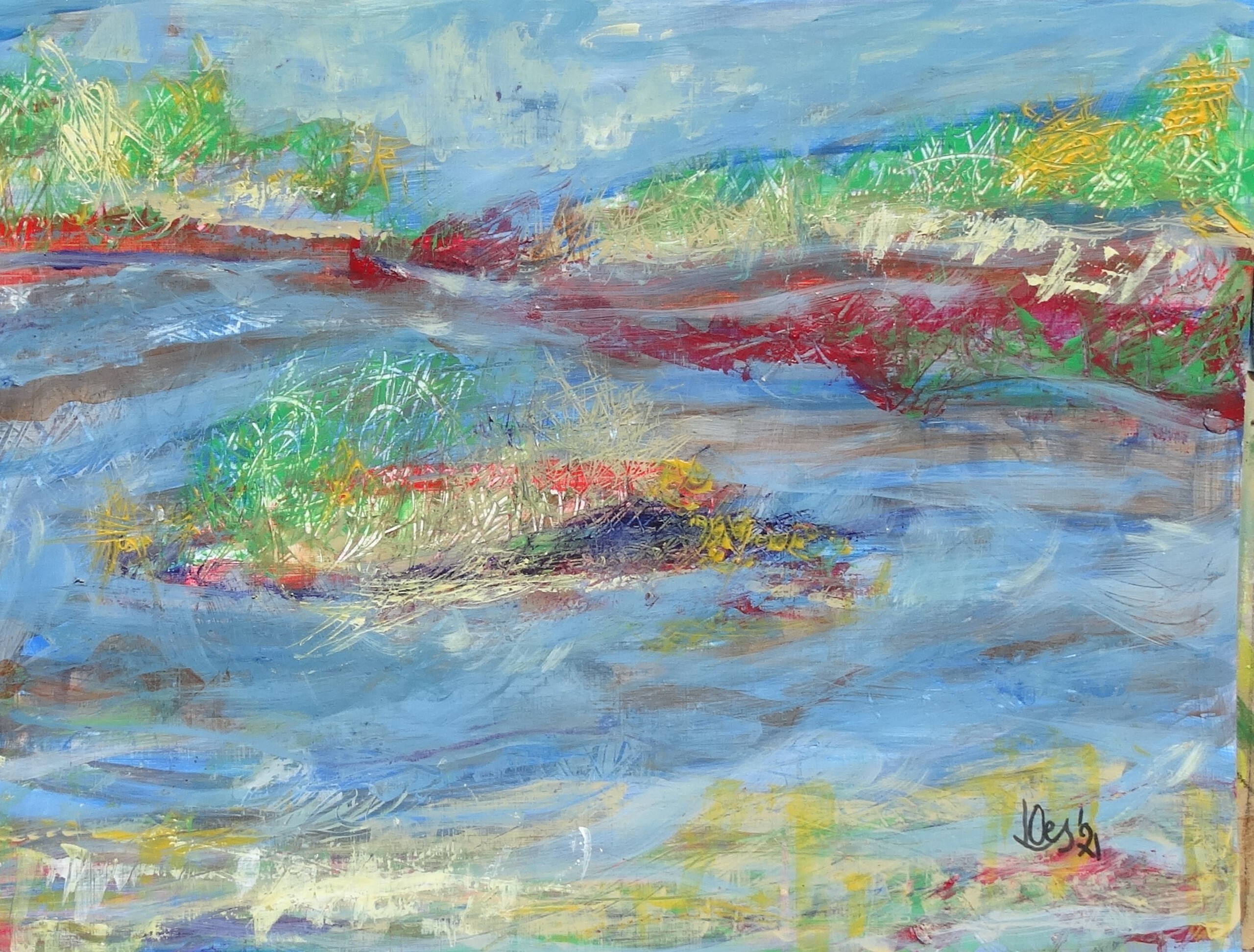 2021, de maas overstroomt door de heftige regenval. Alles is nat. Met geweld perst het water zich door het landschap. Dit heb ik in dit schilderij geexpressioneerd!