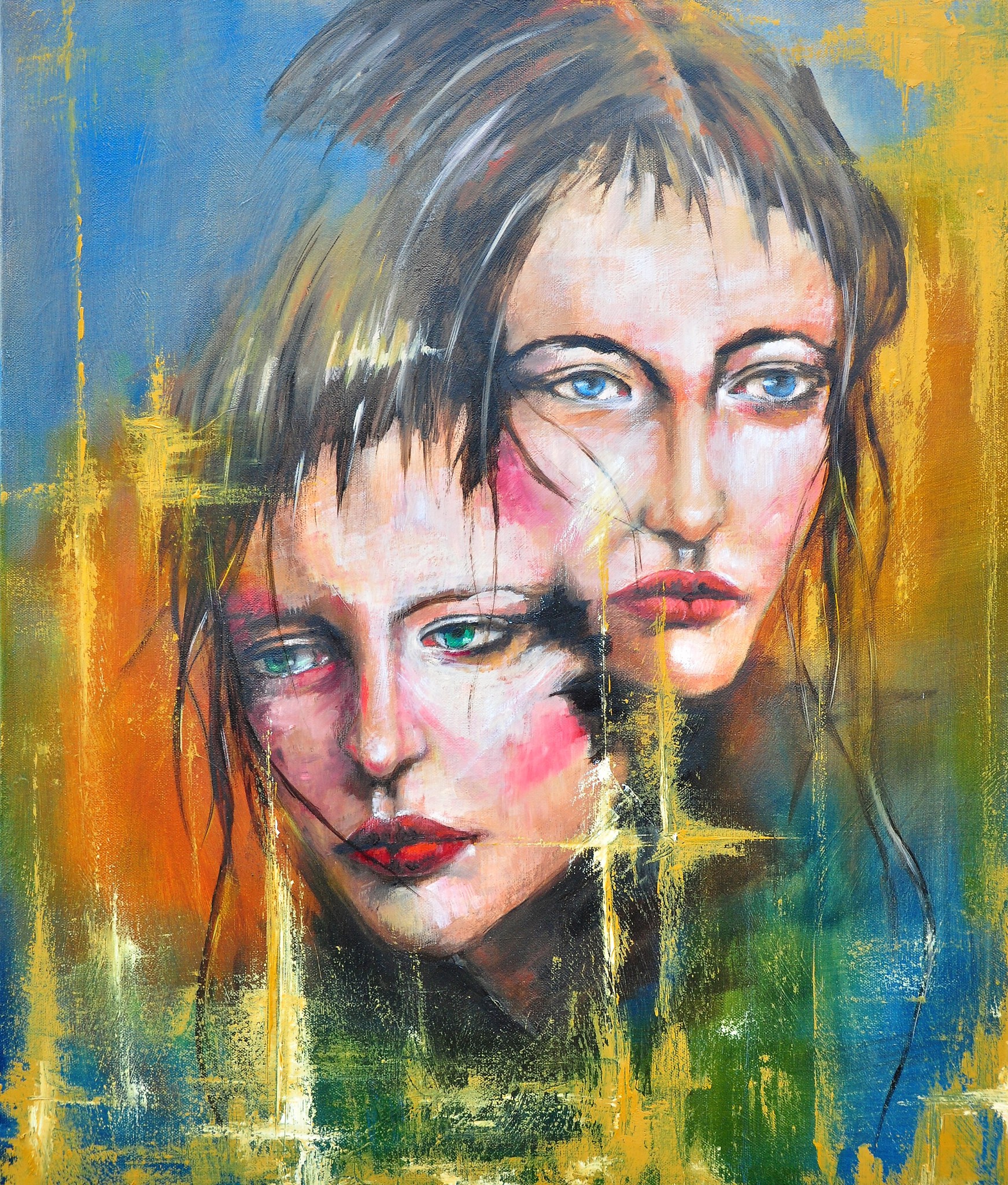 Twee gezichten van jonge mensen - olieverfschilderij op linnen doek