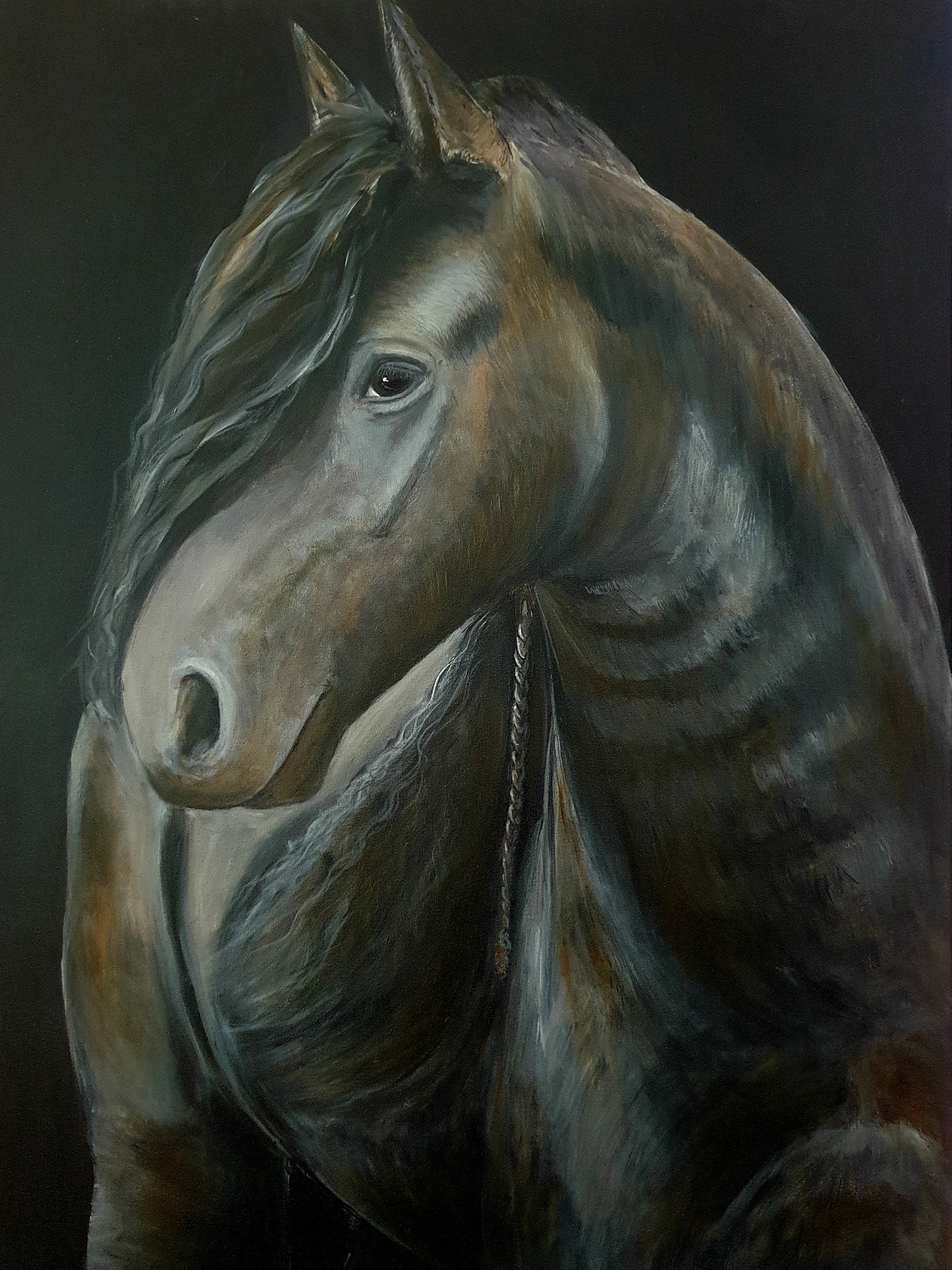 Portret van Tjerk, een Fries paard. Met acryl geschilderd. Is afgelakt en heeft een vintage zilveren baklijst.