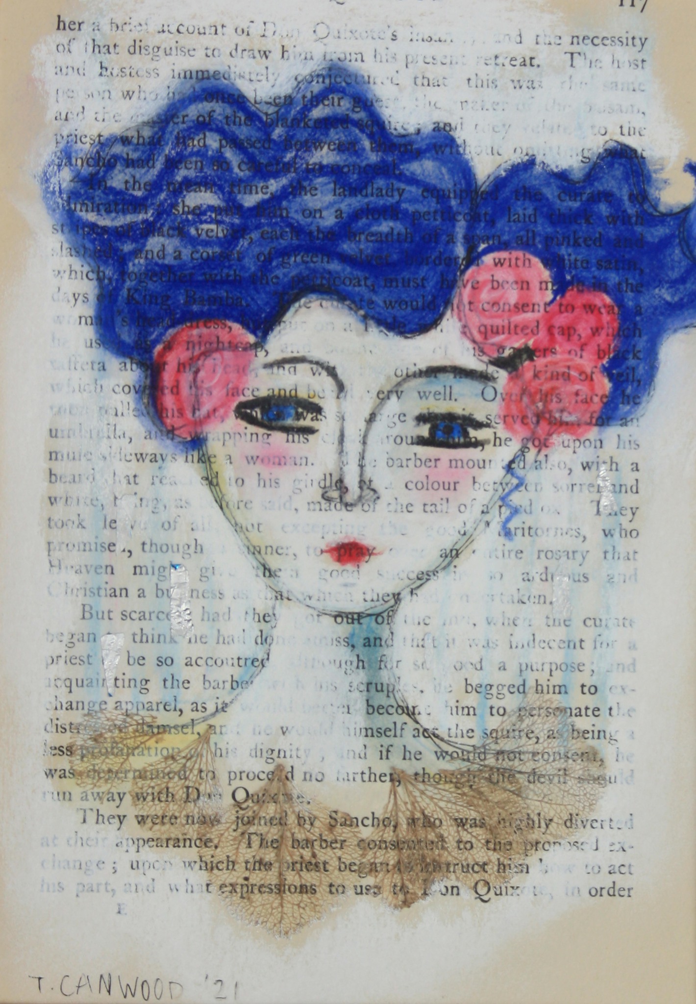Portret in krijt en gedroogde hortensiablaadjes op een bladzijde uit een boek uit 1929.