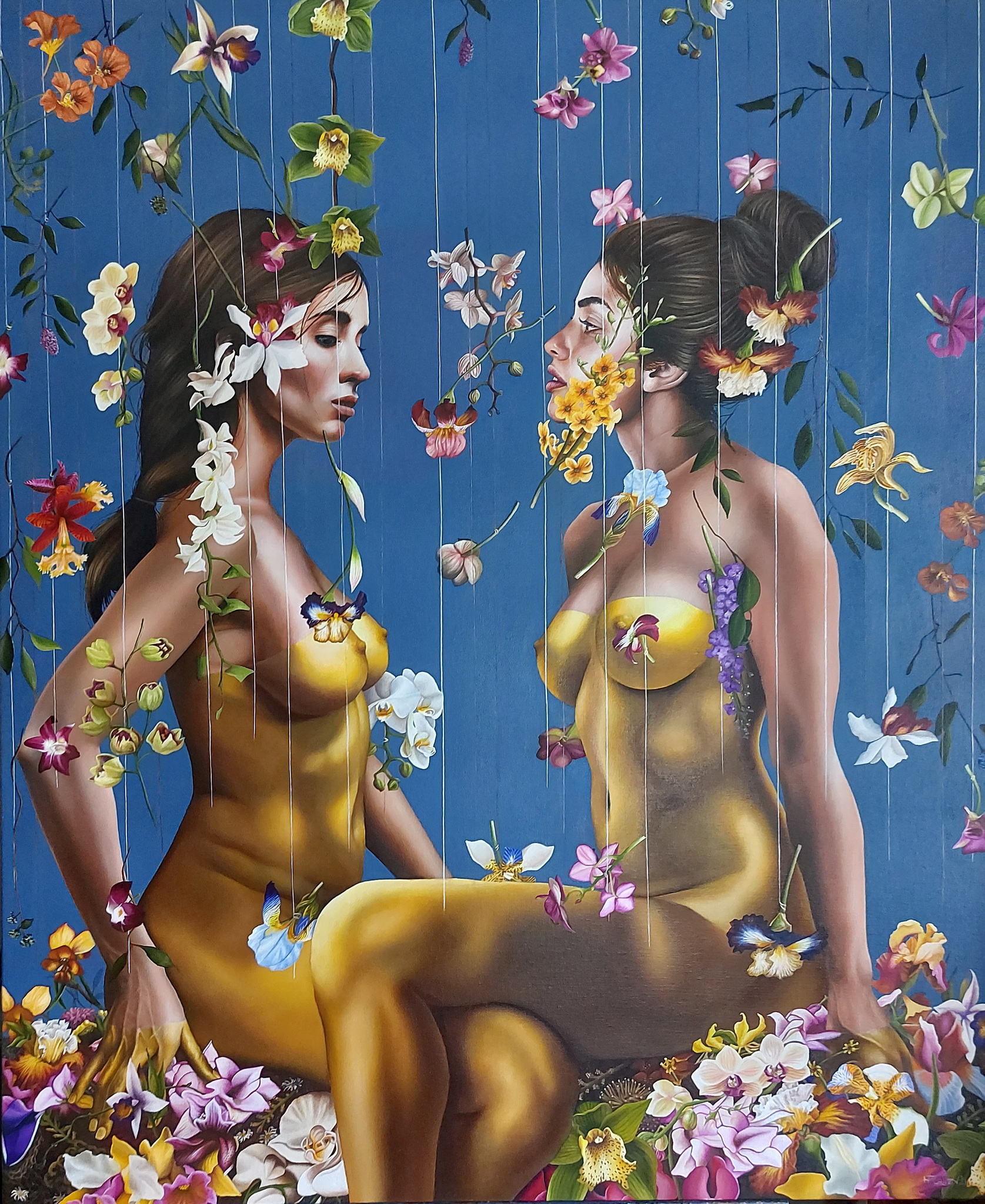 Twee naakte vrouwen met goudkleurige bodypaint omringt door orchideeën Olieverf en Alkyd Verkrijgbaar als giclée (print op linnen) www.tresart.nl