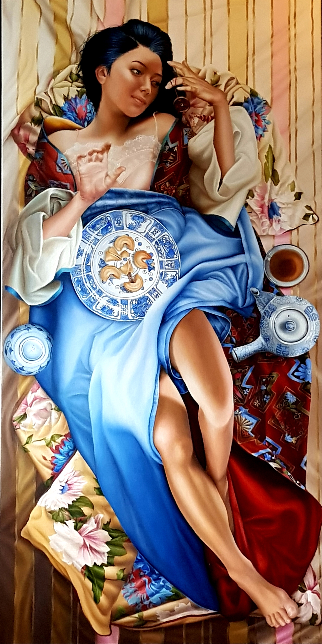 Gechilderd vanuit een hoog perspectief. Liggende vrouw met thee en fortune cookies. Olieverf en Alkyd Verkrijbaar als giclée (print op linnen) www.tresart.nl