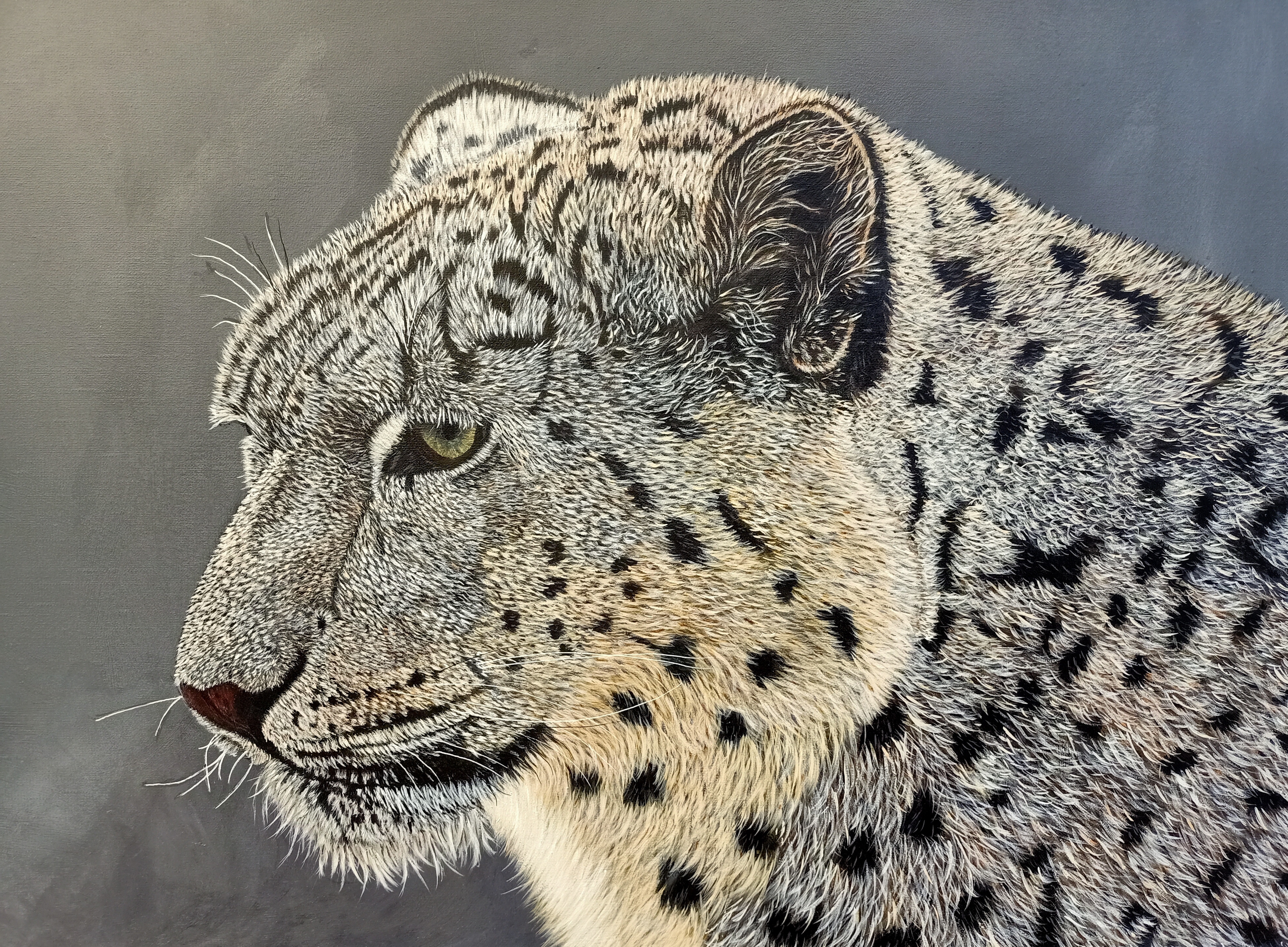 Sneeuw luipaard. Acrylverf op canvas 60 x 80 cm In zwarte baklijst