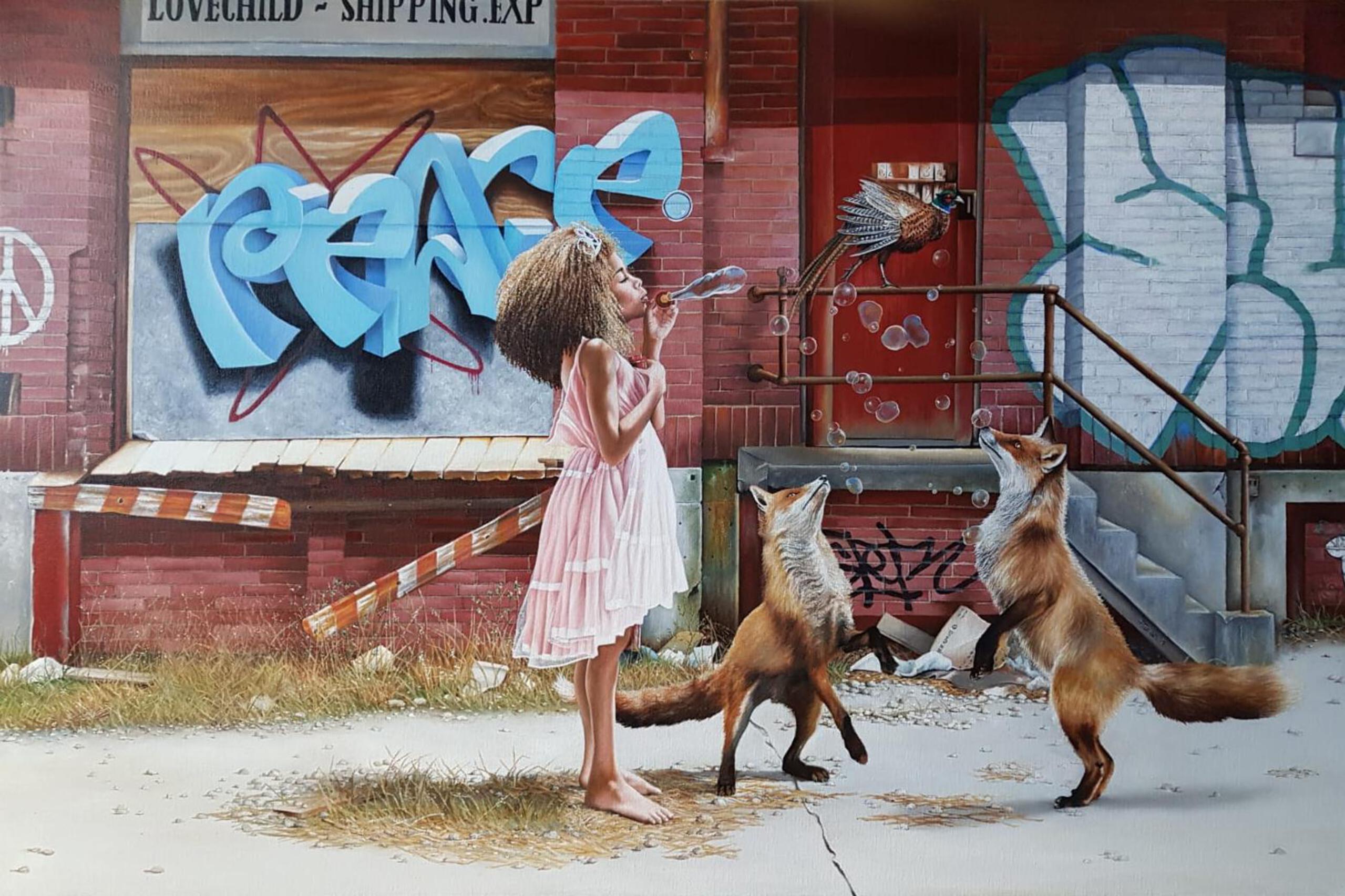 Schilderij Meisje Vogels Vos Fabriek Industrieel