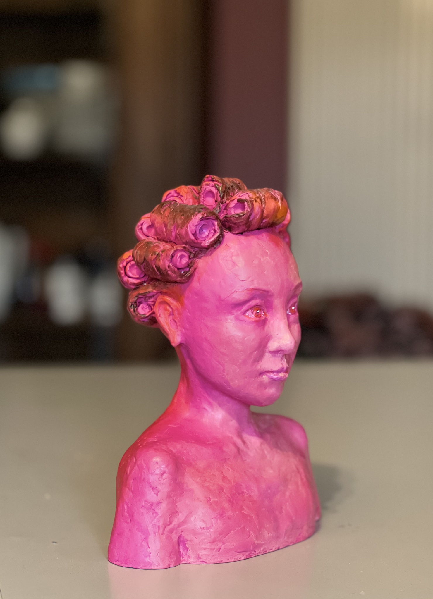 'First date' is geïnspireerd op het schilderij 'Pretty in pink' wat ook meteen de titel is van de film. Het beeld is gegoten in een acrylhars met pigment, daarna verder afgewerkt met professionele hooggepigmenteerde verf in tinten als roze, oranje, geel en bruin. Als eindlaag kreeg zij een laagje vernis. Helga gebruikt het penseel zoals zij het op doek zou schilderen. Met preciese, fijne streken brengt ze het beeld tot leven.