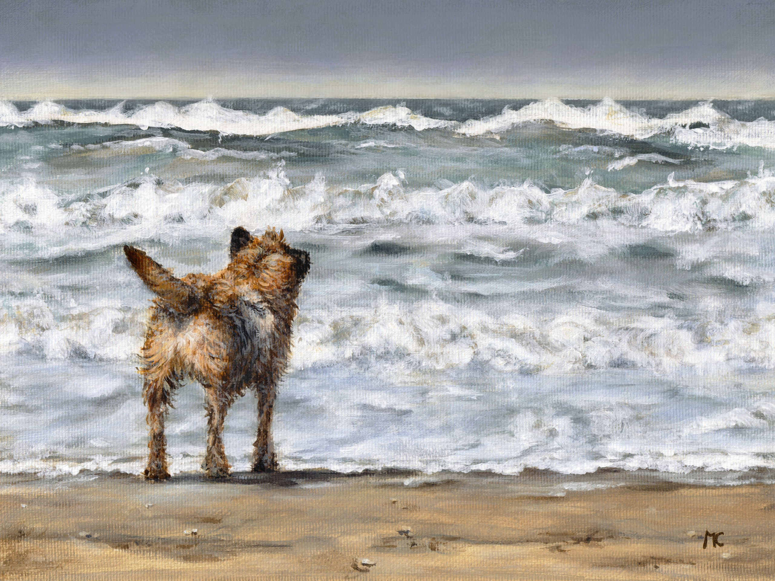 Klein acrylverf schilderijtje op canvasdoek Border Terrier staart naar een overweldigende wilde zee. Formaat: Professioneel canvasdoek 18x24cm