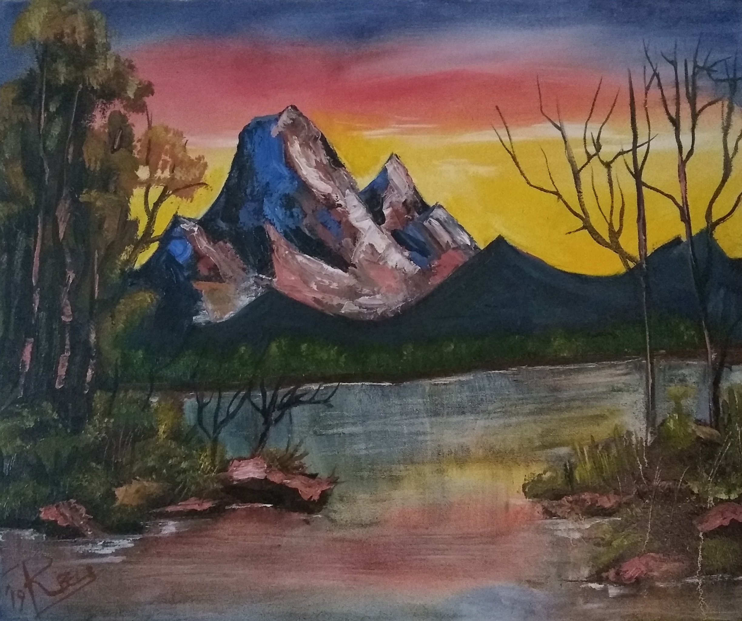 Ik vind de nat in nat techniek een van de fijnste olieverftechnieken. Veruit de beroemdste vertegenwoordiger van de nat in nat techniek is natuurlijk Bob Ross. Ik maak graag af en toe een Bob Ross om de techniek te leren. En het leukste is dat het uiteindelijk "mijn eigen Ross" wordt.