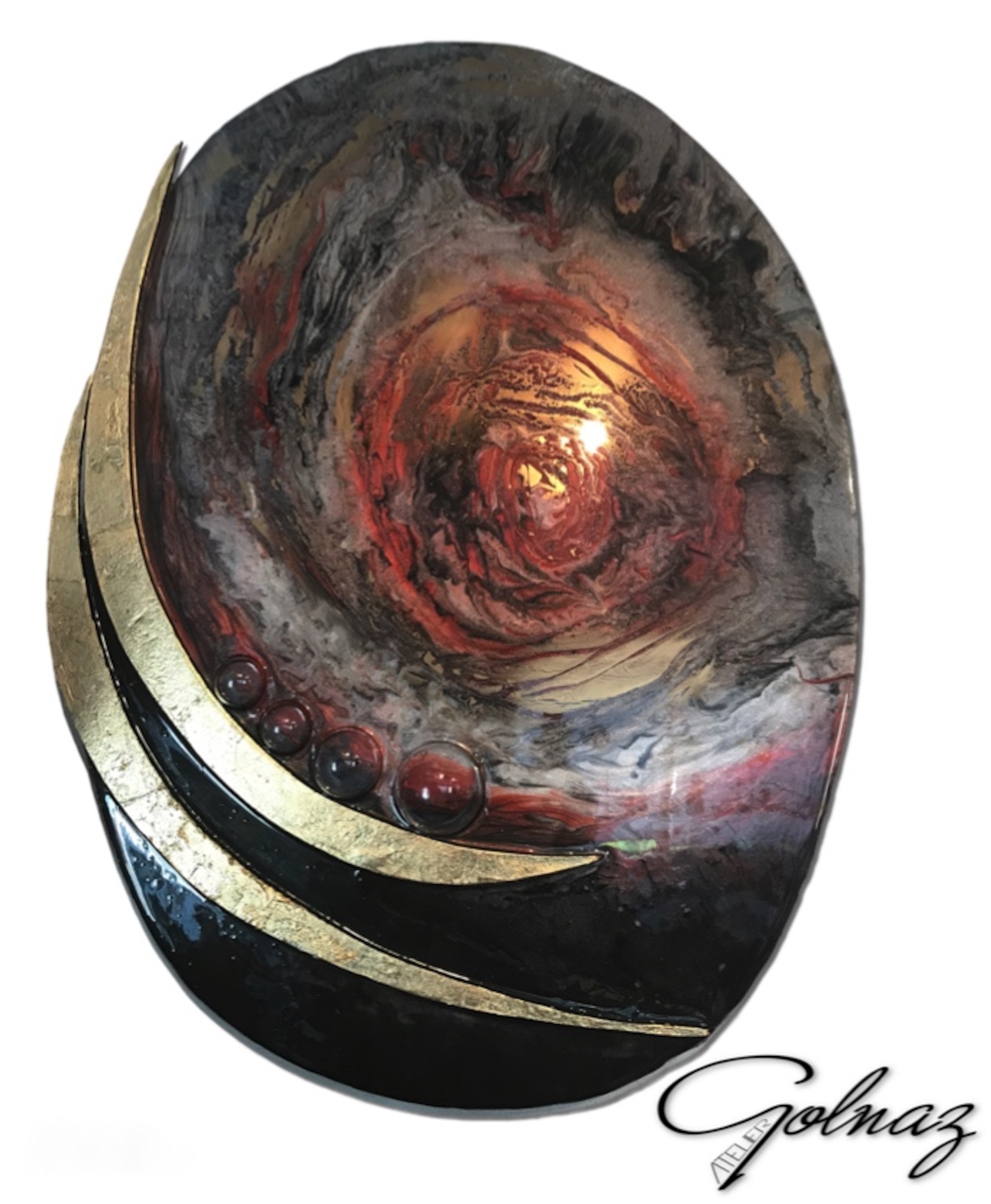 Dit kunstwerk is gemaakt van speciaal materiaal in een willekeurige vorm om de kunst een uniek karakter te geven. Daarna is het bewerkt met speciale epoxyhars en laag voor laag gekleurd (gepigmenteerd) en versierd met bladgoud of glazen voorwerpen. Wenst u dit kunstwerk in een andere kleur die past bij uw interieur, neem dan s.v.p. contact op met de kunstenaar.