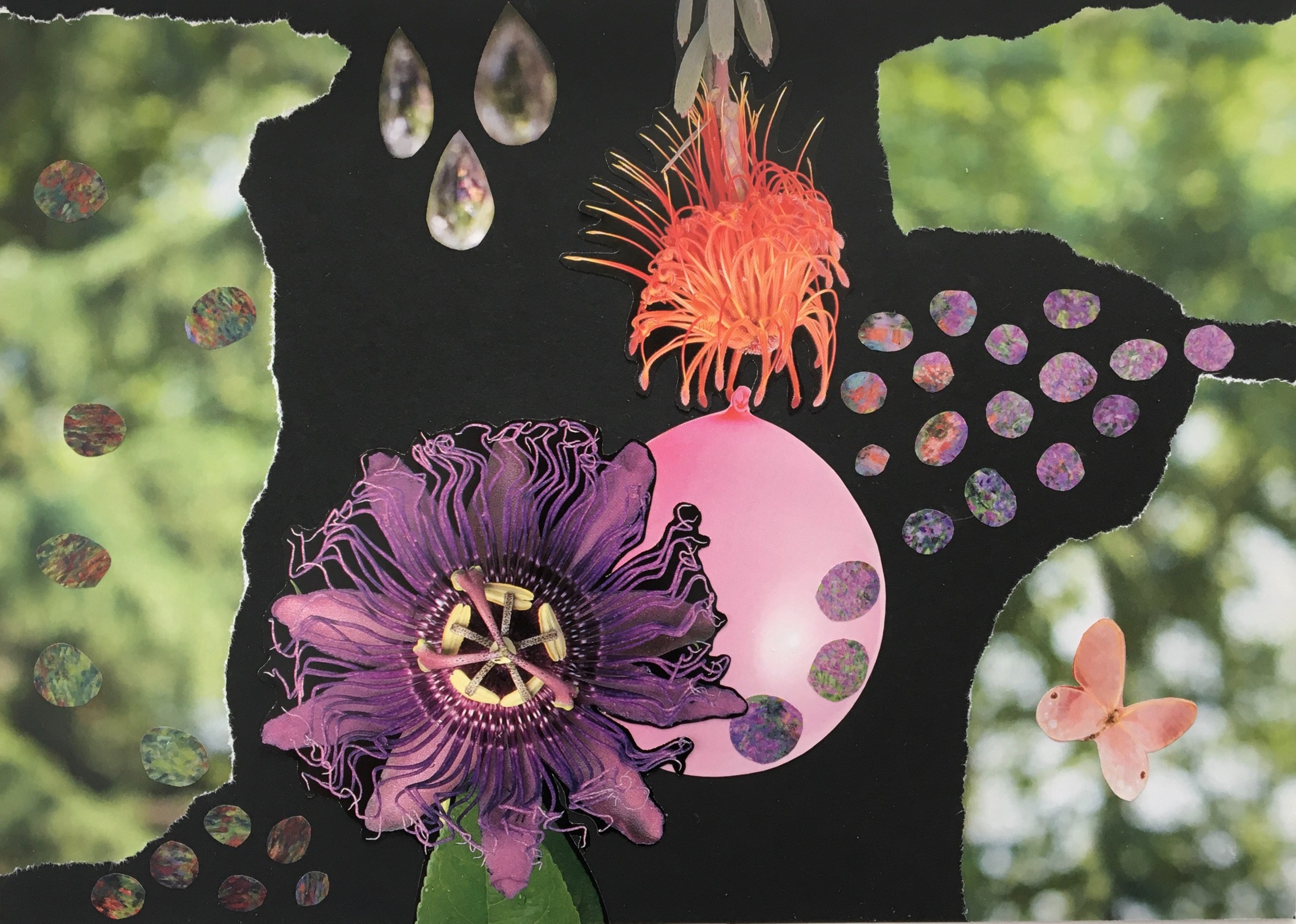 Paars Oranje Roze Ballon Bloemen Groen Vlinder Druppels Collage Papier Verhalend Surreeel Papierkunst Lijm Schaar Spiritueel Collagecoaching Coach Interpreteren Vertalen Papierkunstenaar Intuïtief Flow Kleurig Bewegend