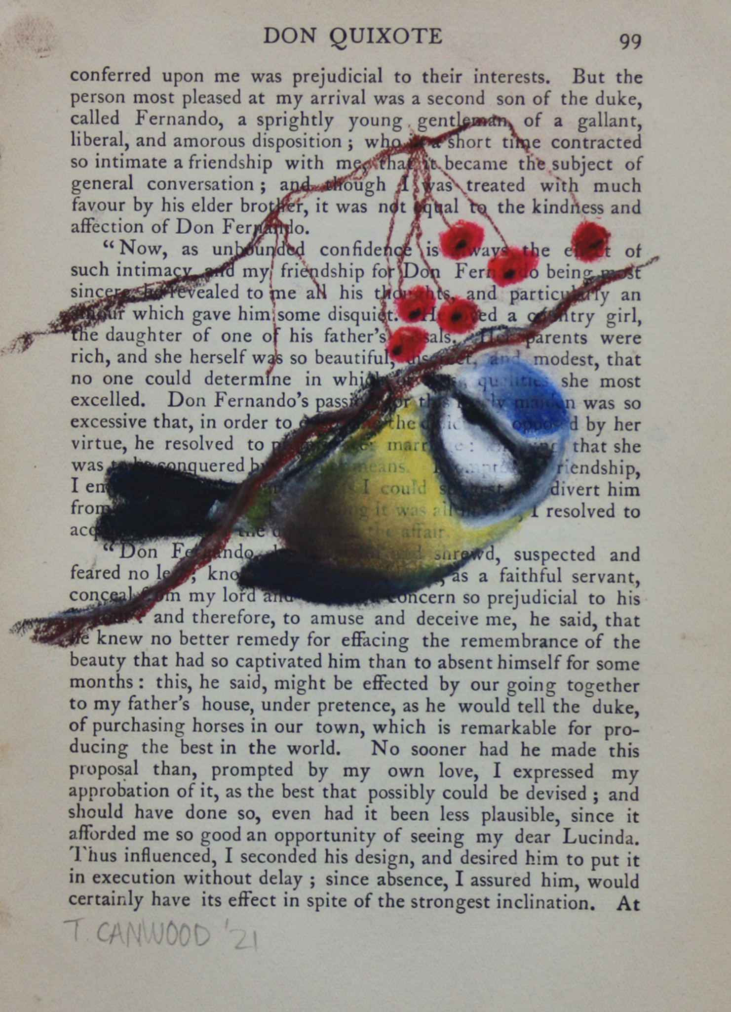 pimpelmees op een bladzijde uit een engelse vertaling van Don Quichotte, een uitgave uit 1929 Deze tekening was meteen nadat ik hem online had gezet verkocht, maar als je iets vergelijkbaars wil, stuur me dan even een bericht.