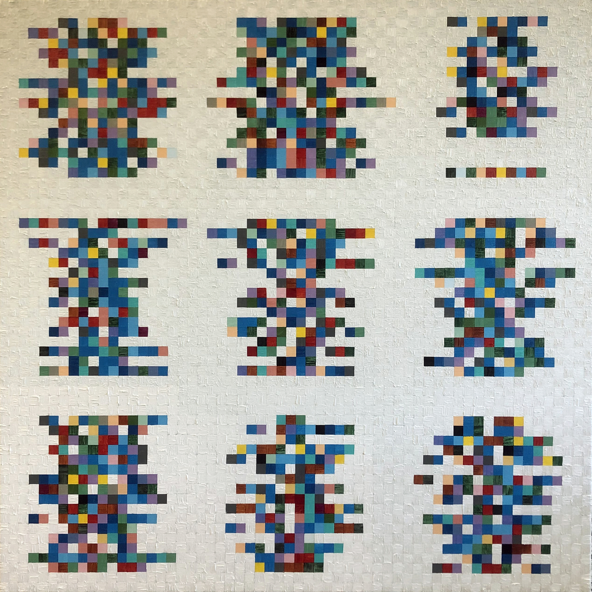 Thema: Chaos (Geometrische Chaos) Mijn kunst is beïnvloedt door de moderne wiskundige en wetenschappelijke benadering van het begrip complexe orde van de natuur. Met name heb ik me verdiept in de Chaos theorie en de fractal geometrie. Ik ben geen wiskundige, en ik gebruik geen wiskundige formules. De ideeën van de Chaos theorie en fractal geometrie leiden tot de ontwikkeling van de composities in mijn werk. Ik gebruik driehoeken,vierkanten en cirkels in mijn schilderijen, maar in mijn huidige serie, geoChao richt ik me alleen op de vierkanten en de verhoudingen tussen de vierkanten. Ik ontwikkel mijn composities door kleine vierkantjes op grote te zetten of grote op kleine te zetten. Het gaat om de onderlinge verhoudingen tussen de vierkanten. Ik laat de methode die ik kies de compositi