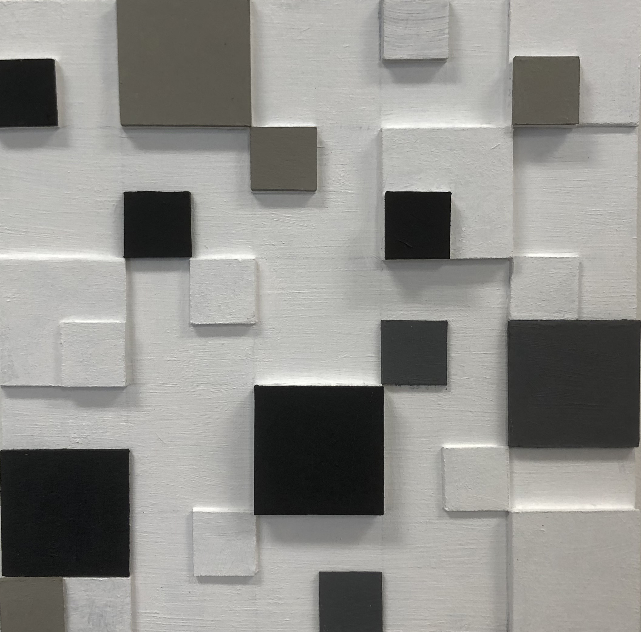 Thema: Chaos (Geometrische Chaos) Mijn kunst is beïnvloedt door de moderne wiskundige en wetenschappelijke benadering van het begrip complexe orde van de natuur. Met name heb ik me verdiept in de Chaos theorie en de fractal geometrie. Ik ben geen wiskundige, en ik gebruik geen wiskundige formules. De ideeën van de Chaos theorie en fractal geometrie leiden tot de ontwikkeling van de composities in mijn werk. Ik gebruik driehoeken,vierkanten en cirkels in mijn schilderijen, maar in mijn huidige serie, geoChao richt ik me alleen op de vierkanten en de verhoudingen tussen de vierkanten. Ik ontwikkel mijn composities door kleine vierkantjes op grote te zetten of grote op kleine te zetten. Het gaat om de onderlinge verhoudingen tussen de vierkanten. Ik laat de methode die ik kies de compositi