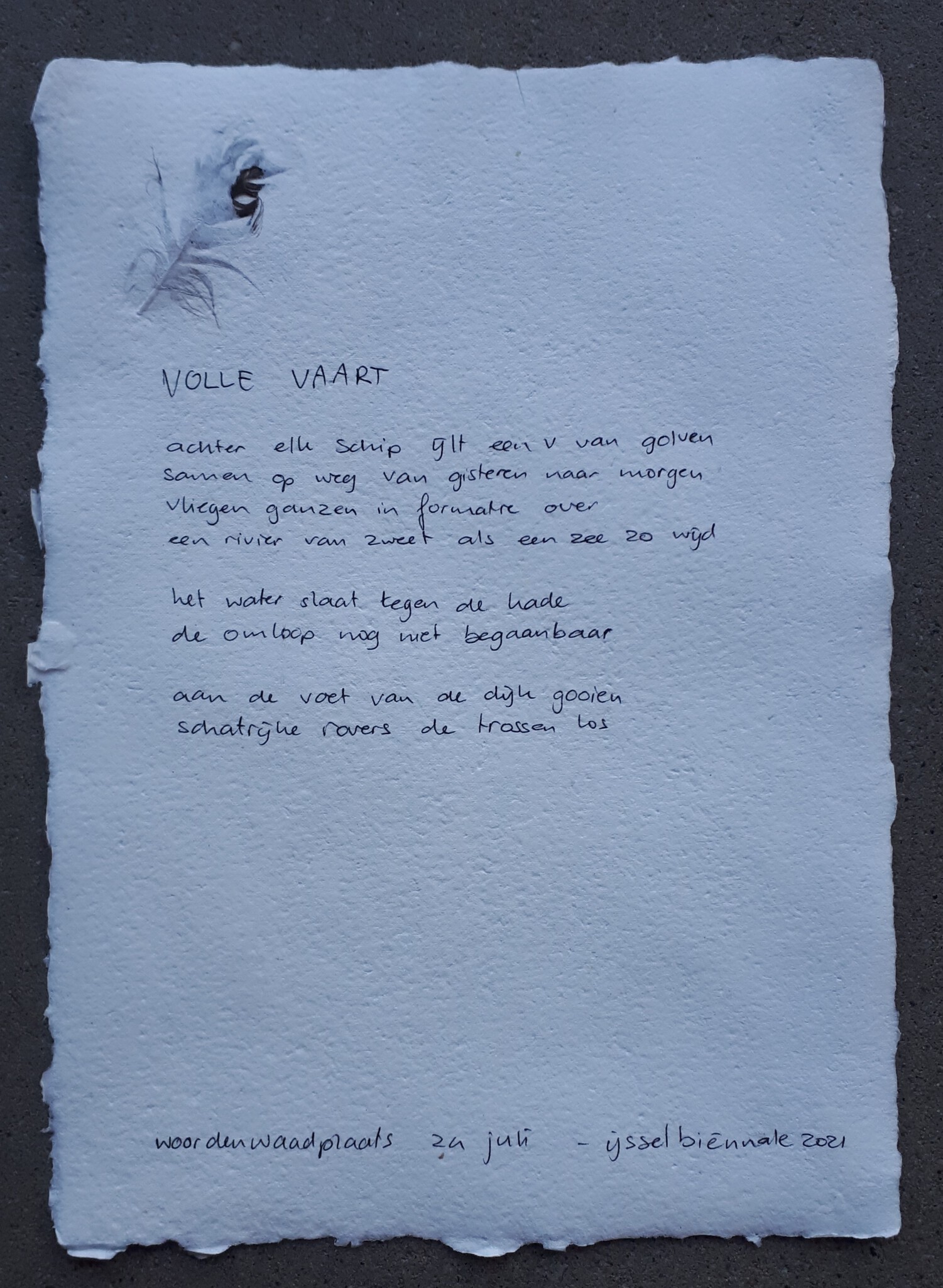 Daggedicht 6 van 24 juli 2021 op handgeschept ijsselpapier (linnen met gejutte veer)