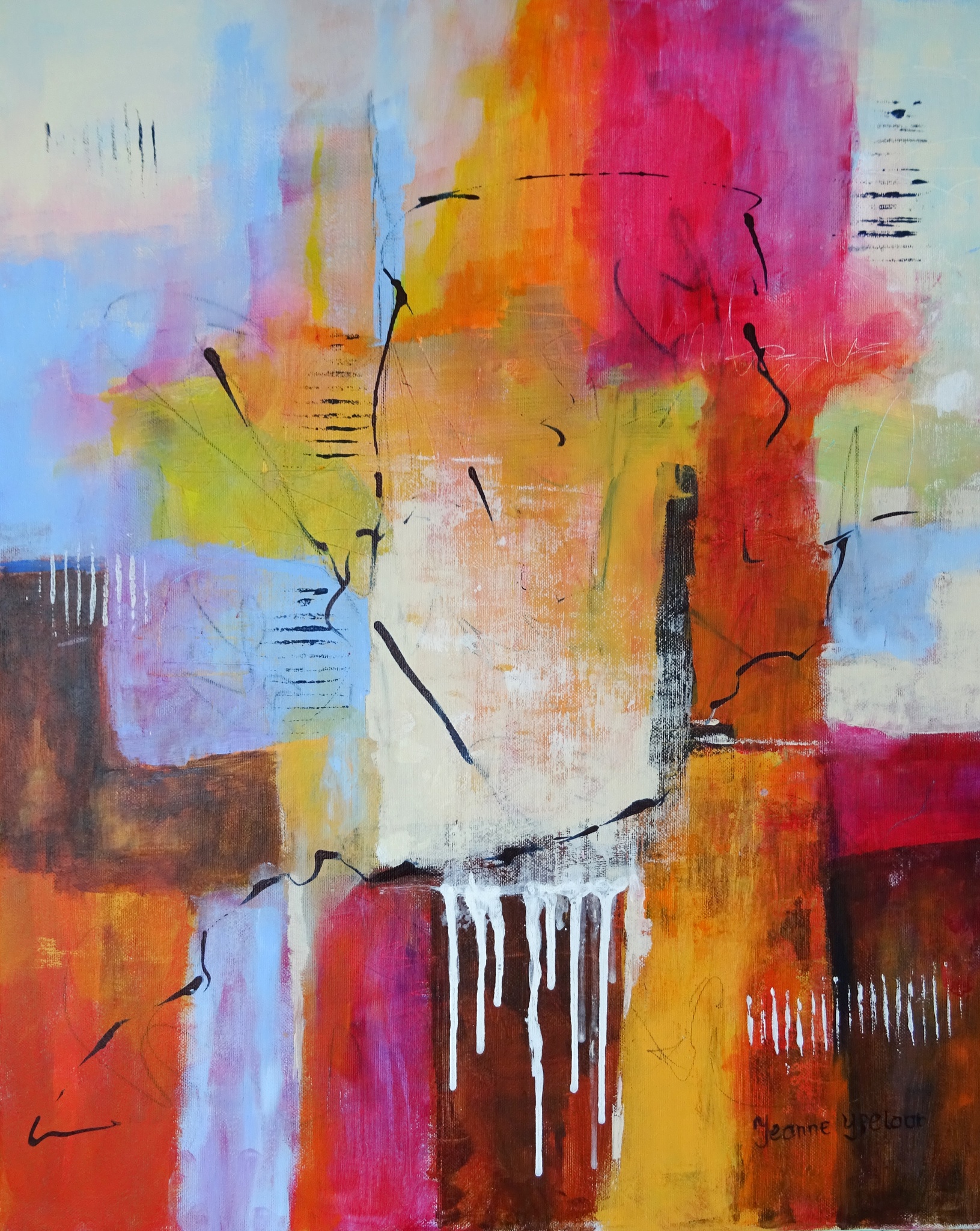 Mijn naam is Jeanne IJpelaar. Geboren in Loon op Zand. Als kind was ik altijd met potlood en verf in de weer. Jaren heb ik niets gedaan totdat ik weer in aanraking kwam met schilderen. Ik heb diverse workshops en cursussen gevolgd. Schilderen is voor mij kleur, verf, geur, nadenken en de tijd vergeten. Vaak staat er muziek op en dan lijkt het of ik in een eigen wereld vertoef waar ik heerlijk alles kan vergeten. Het liefst werk ik met aquarel en acryl verf met daarbij diverse materialen zoals zand, schelpen, papier, draad e.d. die ik dan verwerkt. Het is een uitdaging om met deze materialen een schilderij te maken waarvan ik kan zeggen dat het klopt. Schilderen is voor mij dan ook een uitlaatklep, even alles vergeten en bezig zijn met het maken van iets moois.