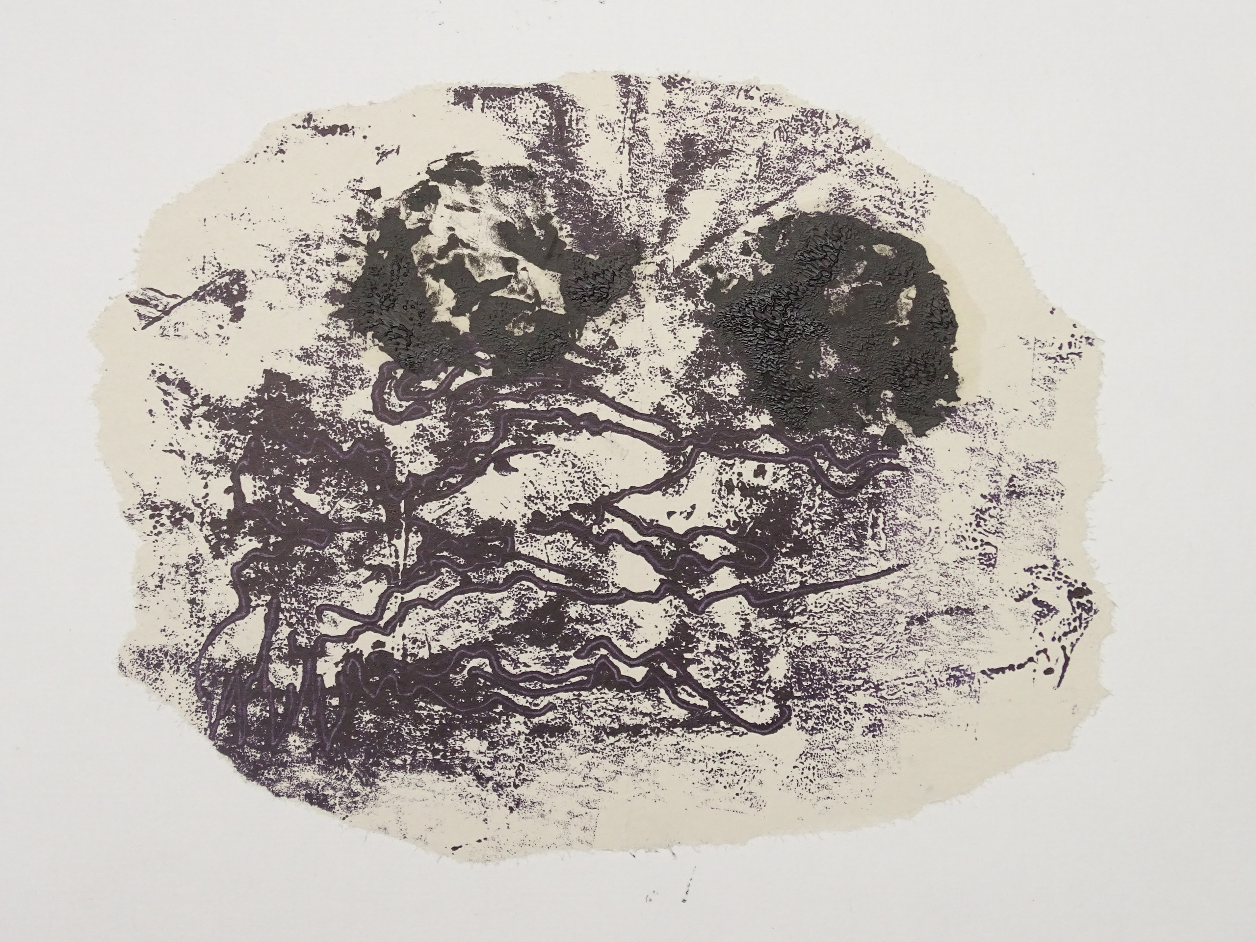 "soms loopt de grens / rondom de beperkingen" monotype, beeld 17x13 cm