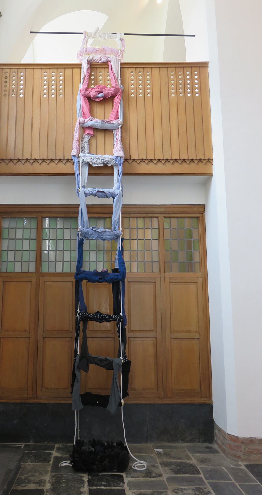 Hangende installatie van 9 m lang, genaaid van overhemden, touw, hout, garen.