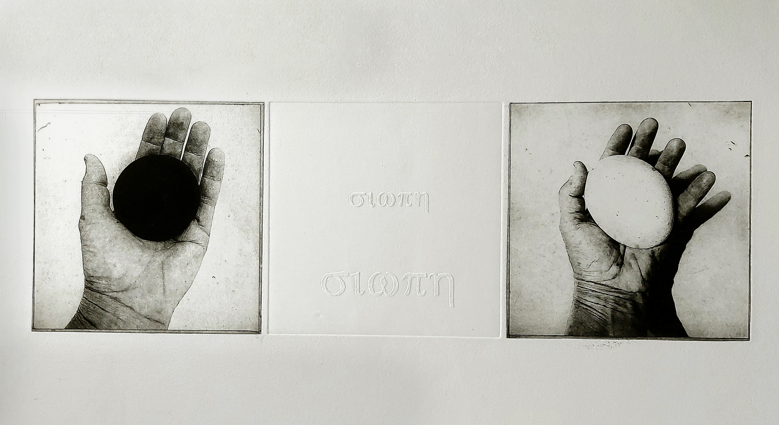 The works Siopi (silence) are made for the exhibition project Small Odyssey, a Greek-Dutch cultural exchange. Photo-etchings from my own hands, holding a black or white stone, found on the beach in Greece, combined with a picture of the perfect oval shape, an egg. This picture I made in Venice, and it just fitted perfect with the image I wanted to show. It is the beginning of a serial of prints where I I want to depict my personal Odyssey. As printmaker, as person living between two countries.