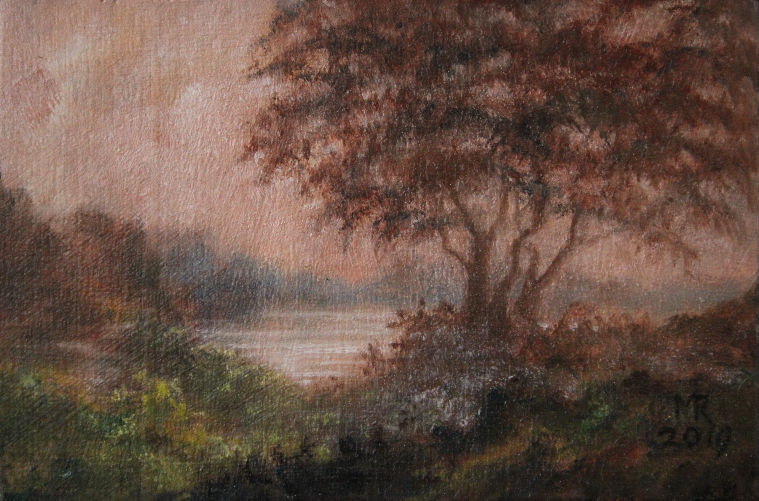 Uit de serie “Droomlandschapjes”: Een fantasie schilderijtje(olieverf/paneel), ontstaan uit een abstract vlekkenpatroon waarbij het voor mij ook altijd een verrassing is wat eruit komt. Inclusief de lijst zijn de maten 16,5 x 21 cm.