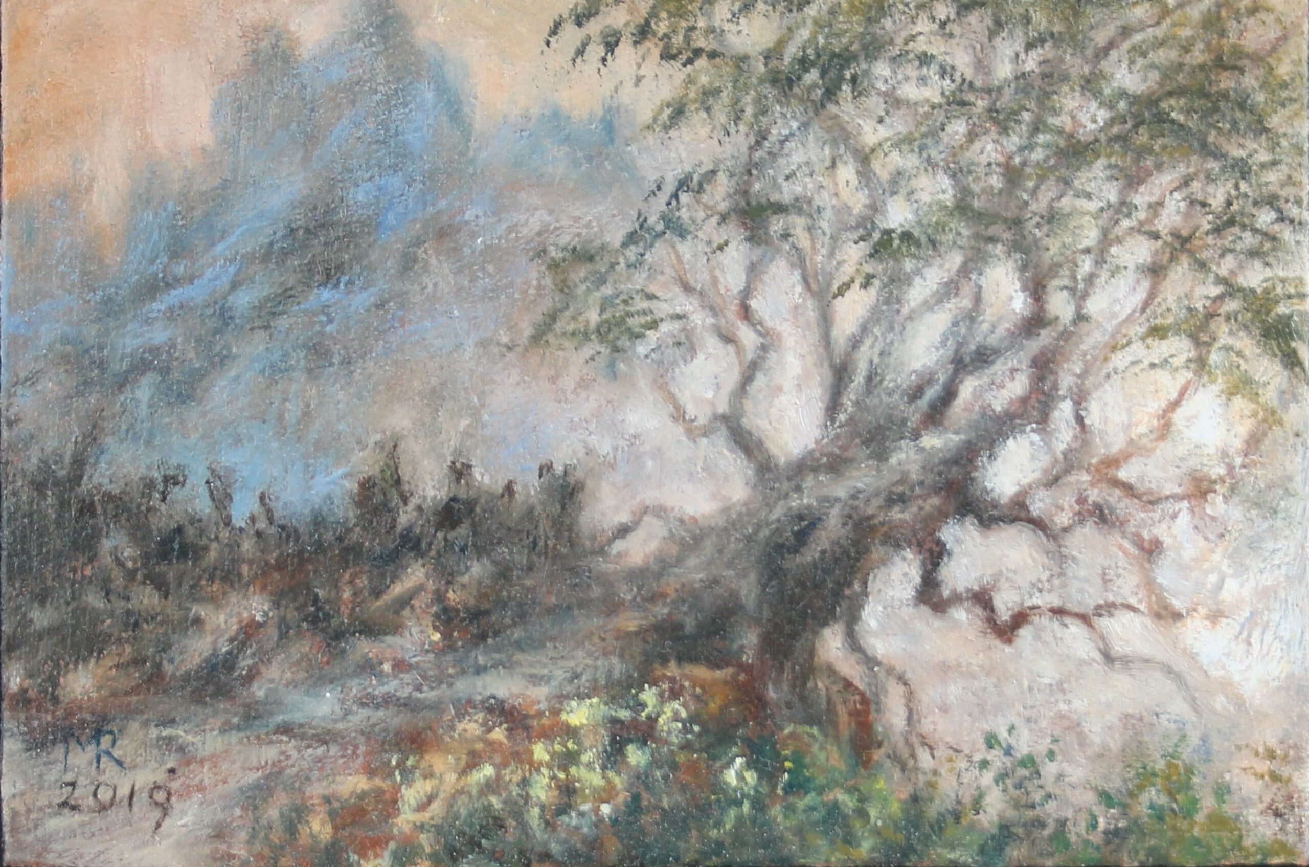 Uit de serie “Droomlandschapjes”: Een fantasie schilderijtje(olieverf/paneel), ontstaan uit een abstract vlekkenpatroon waarbij het voor mij ook altijd een verrassing is wat eruit komt. Inclusief de lijst zijn de maten 16,5 x 21 cm.